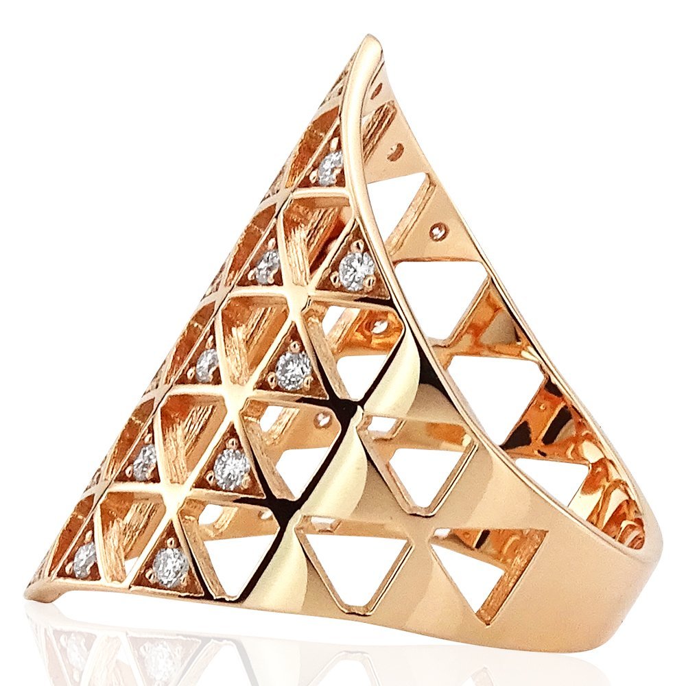 Toplam 0,42 karat pırlanta ile tasarlanan bu göz alıcı yüzük, geometrik simetriyi ihtişamla buluşturuyor. Üçgen formlarla örülmüş zarif iskelet yapısı, her köşesinde parlayan pırlantalarla modern ve güçlü bir duruş sergiliyor. Kırmızı altının sıcak ışıltısıyla birleşen bu detaylar, her bakışı üzerine çekecek bir tasarımın temelini oluşturuyor. Sanatsal bir duruşa sahip bu yüzük, stil sahibi kadınların imza parçası olmaya aday.
