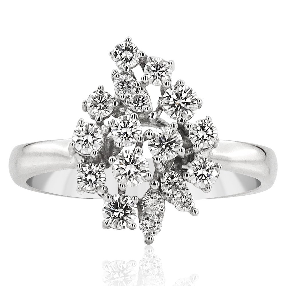 0,59 karat pırlantalarla bezeli bu yüzük, modern dokunuşlarla şekillendirilmiş, çok taşlı asimetrik tasarımıyla dikkat çekiyor. Farklı yüksekliklerde konumlandırılmış yuvarlak kesim pırlantalar, ışığı her açıdan yakalayarak parıltıyı maksimuma çıkarıyor. Klasikten uzak, cesur ve yenilikçi stilin ışıltılı bir temsilcisi. Bu yüzük, sıradanlıktan uzak durup kendi yolunu çizenlere özel bir imza niteliğinde.