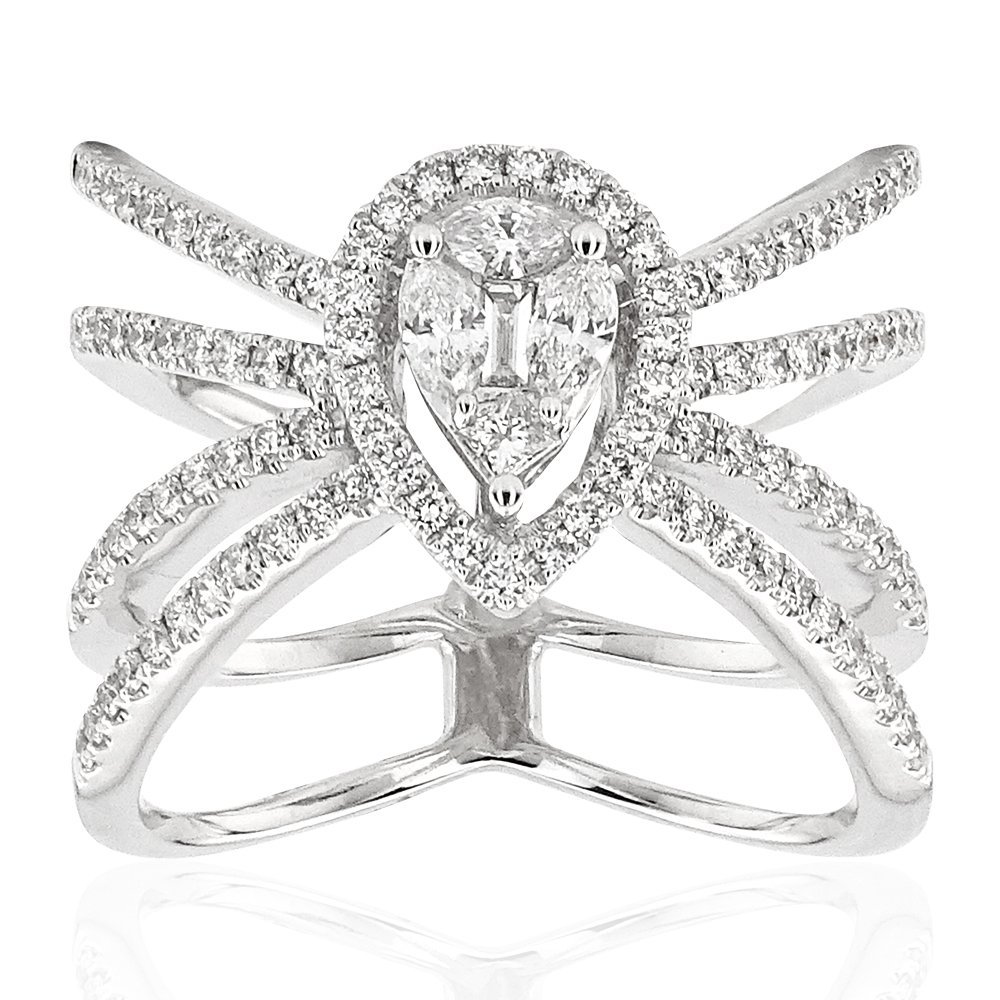 0,72 karatlık bu göz kamaştırıcı tasarım, merkezinde yer alan markiz, baget ve prenses kesim taşlarla güçlü bir geometrik armoni yaratıyor. Tüm bu zarafetin etrafını saran yuvarlak kesim pırlantalar ise ışığın her açıdan yakalanmasını sağlayarak yüzüğe ışıltılı bir taç kazandırıyor. Hem klasik zarafetin hem çağdaş çizgilerin buluşma noktası olan bu yüzük, parmakta adeta bir mücevher vitrayı gibi parlıyor.
