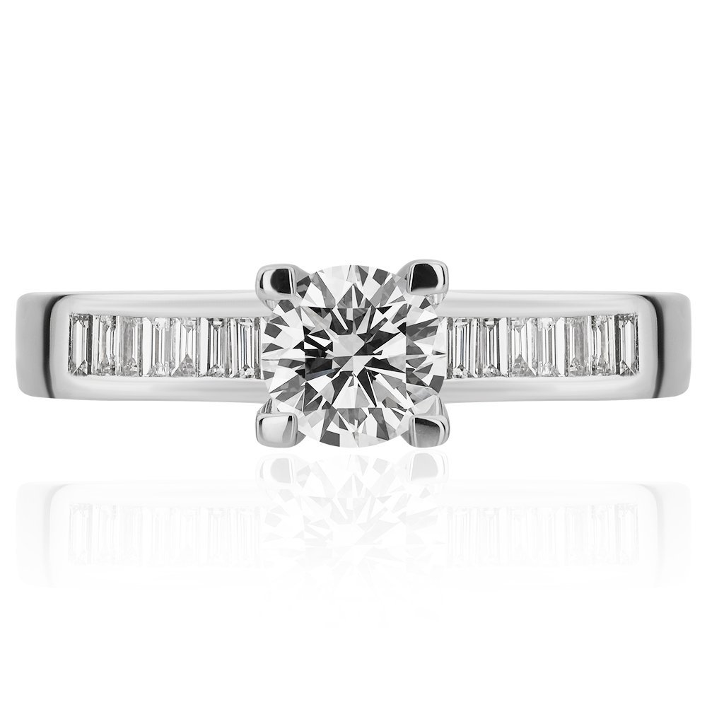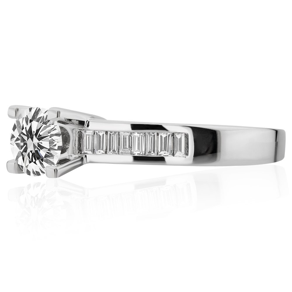 1.04 karat pırlanta ile tasarlanan bu yüzük, merkezdeki yuvarlak kesim taşın ışıltısını yanlarda sıralanan baget kesim pırlantalarla bütünleştiriyor. Beyaz altının modern duruşu, taşların net çizgileriyle birleşerek zamana karşı güçlü bir tasarım dili oluşturuyor. Dengeli formu ve zarif detaylarıyla her anı özel kılan bir seçim.