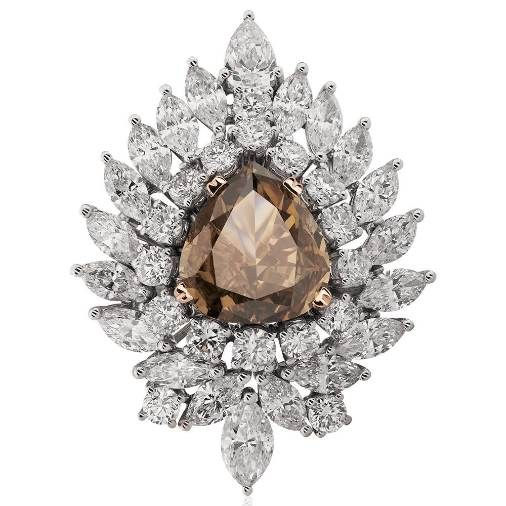 Toplamda 10,96 karatlık bu yüzük, adeta bir mücevher baharına ev sahipliği yapıyor. Merkezde yer alan iri, damla kesim Fancy kahverengi pırlanta; kırmızı altın tırnaklarla sabitlenerek hem sıcaklığını hem ihtişamını ön plana çıkarıyor. Etrafını çepeçevre kuşatan markiz ve yuvarlak kesim pırlantalar ise fırtınalı bir zarafet etkisi yaratıyor. Etkileyici duruşuyla bu tasarım, sıradanlığa meydan okuyanların hikâyesini parmak uçlarına taşır.