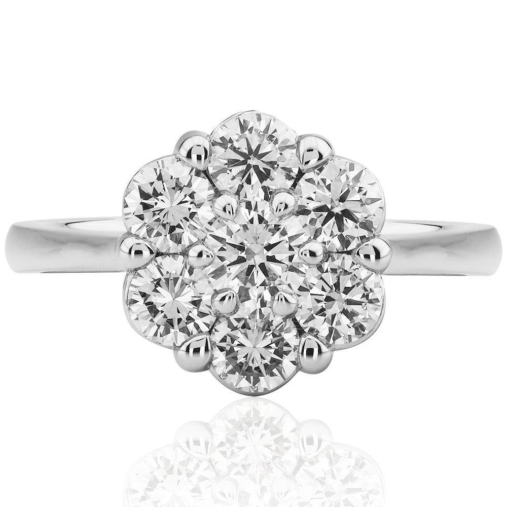 1,26 karat pırlantanın çiçek formunda birleştiği bu yüzük, ışıltıyı zarif bir doğallıkla sunuyor. Her biri özenle yerleştirilmiş yuvarlak kesim pırlantalar, beyaz altın üzerine yerleşerek göz alıcı bir simetri oluşturuyor. Klasik tasarımı modern bir dokunuşla yorumlayan bu model, ışığın her kıvrımda dans ettiği çarpıcı bir parıltı vadediyor.