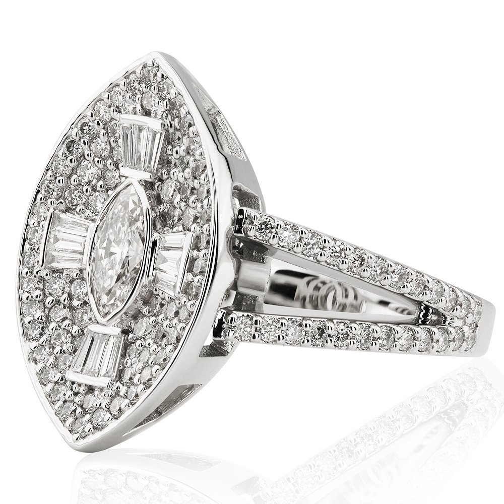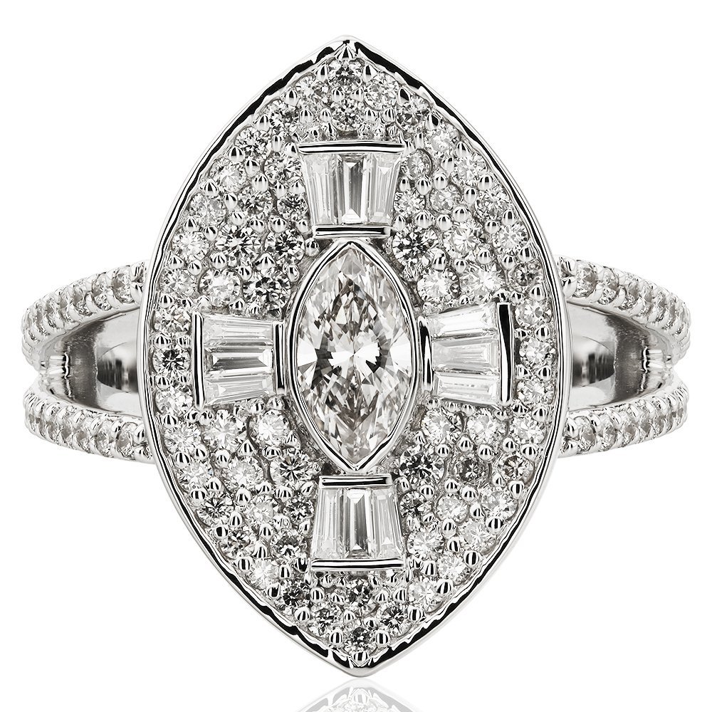 1,35 karat ışıltısıyla göz alan bu yüzük, merkezde yer alan zarif markiz kesim pırlanta ile baş döndürüyor. Çevresini dört yandan saran trapez kesim pırlantalar, taşın zarafetini vurgularken, arka planda parıldayan mikro yuvarlak kesim pırlantalar tasarıma derinlik ve ihtişam katıyor. Beyaz altın üzerine yerleşen bu etkileyici form, hem klasik hem de modern çizgilerin büyüleyici bir birleşimi. Yüzüğün üst kısmı, ihtişamlı bir duruşla adeta göz kamaştırıcı bir mücevher portresi çiziyor.