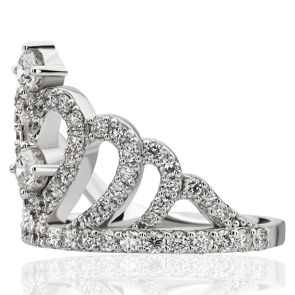 1,48 karat pırlantayla süslenmiş bu beyaz altın yüzük, bir taç formunda tasarlanarak zarafeti ihtişamla buluşturuyor. Kalp figürleriyle harmanlanan bu detaylı işçilikte, merkezdeki iki yuvarlak pırlanta tüm kompozisyonun parıltısını vurgularken, yüzeyin tamamına yayılan küçük taşlar ışığı her açıdan yansıtarak gösterişli bir ışıltı sunuyor. Klasik bir peri masalının modern yorumu niteliğindeki bu tasarım, kendini kraliçe gibi hissetmek isteyenler için asil bir dokunuş taşıyor.