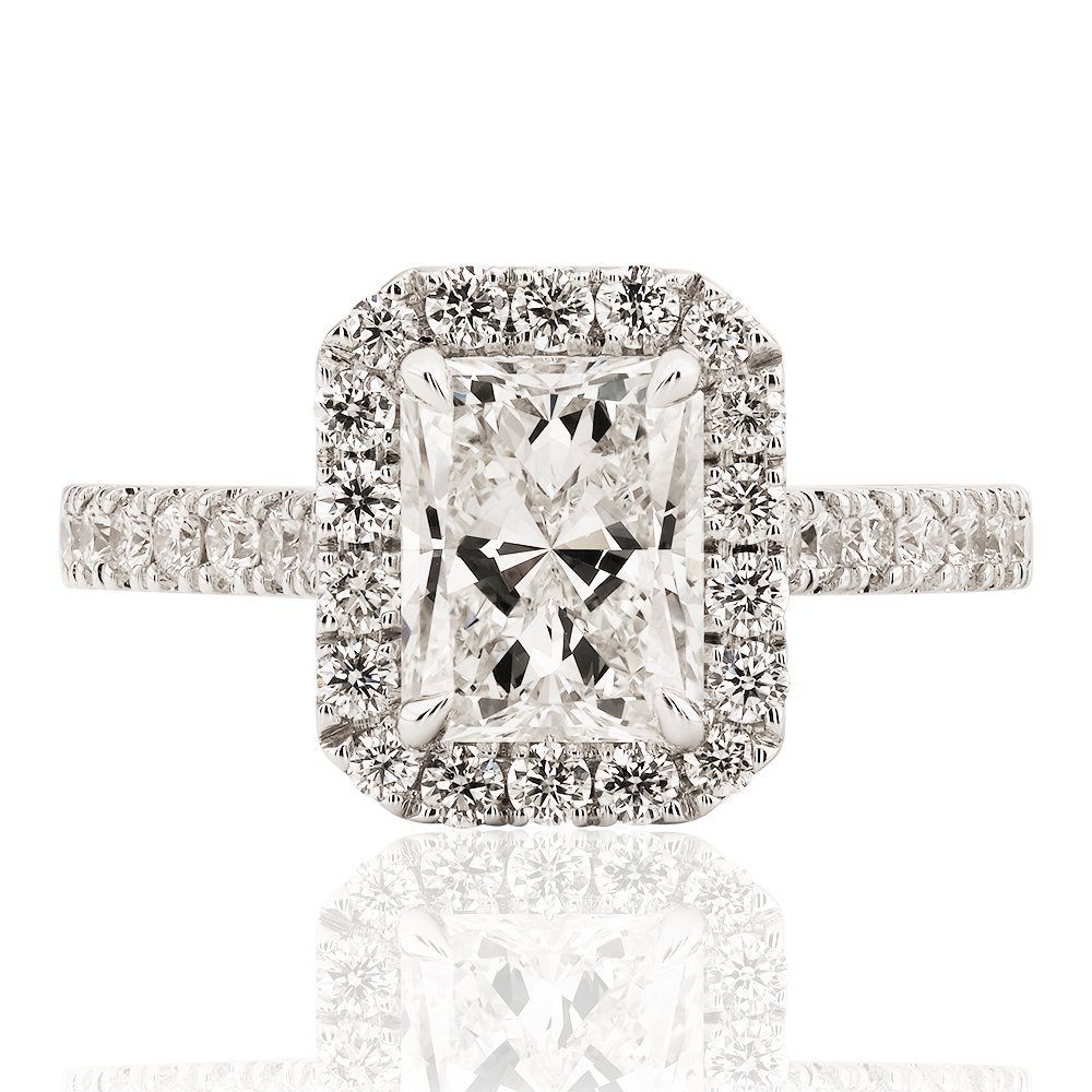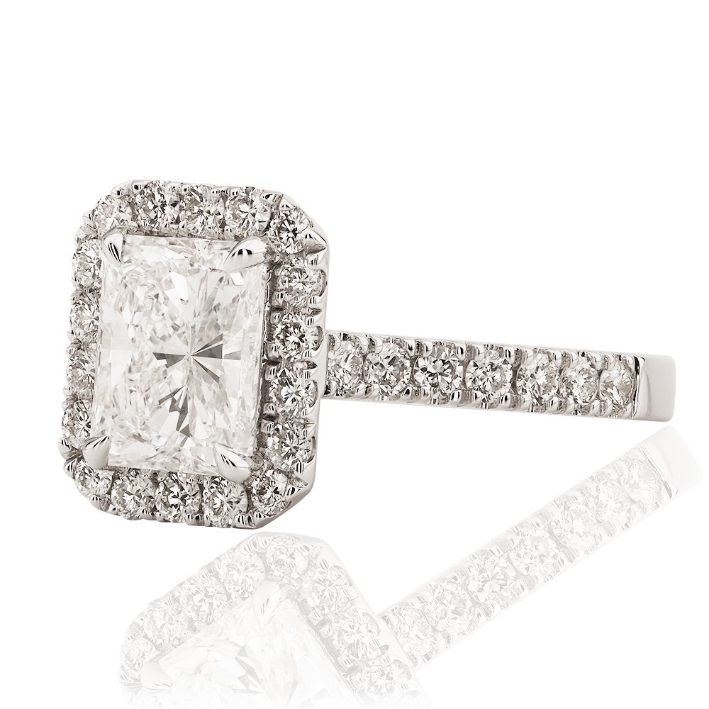 Toplamda 1,51 karat ağırlığındaki bu zarif yüzükte, merkezde yer alan büyüleyici radyant kesim pırlanta, dört güçlü tırnakla taşın şıklığını ortaya çıkarıyor. Çevresini saran yuvarlak kesim pırlantalarla oluşturulan halo, taşın ışıltısını ikiye katlarken, pırlanta işlemeli beyaz altın band yüzüğe zarif bir denge katıyor. Modern tasarım detaylarını klasik formlarla buluşturan bu parça, ışıltının gücünü hissettirmenin en rafine hali.