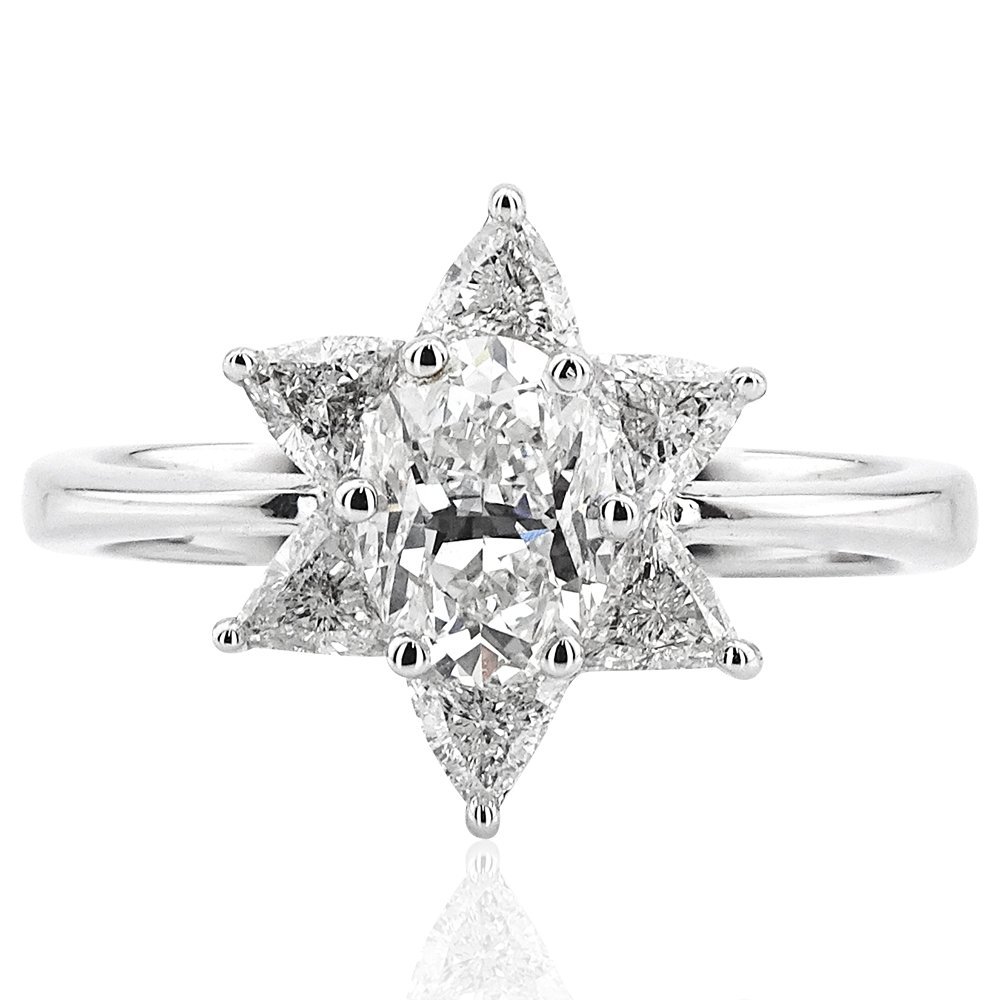 1,58 karat pırlantayla tasarlanan bu yüzük, yıldız formunda kurgulanmış göz alıcı bir ışıltı sunuyor. Merkezde yer alan zarif oval kesim taş, üçgen kesim pırlantalarla çevrelenerek adeta yıldızlararası bir zarafete dönüşüyor. Parlaklık ve asaletin bu eşsiz birleşimi, klasik çizgilere modern bir dokunuş katıyor.