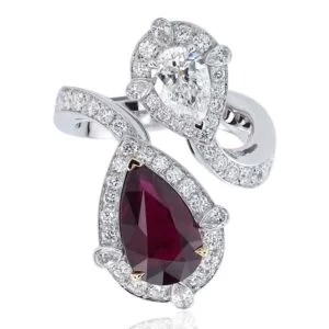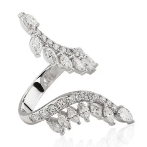 Bu yüzüğün toplam karatı 1,65 ct’dir. Dinamik kıvrımlarıyla öne çıkan beyaz altın tasarım, farklı boyutlardaki pırlantaların kusursuz dizilimiyle parmaklarınızda zarifçe dans ediyor. Estetik detayları ve modern çizgileriyle fark yaratan bu yüzük, her bakışta büyüleyici bir etki bırakıyor. Tarzınızı unutulmaz kılacak ışıltılı bir dokunuş.