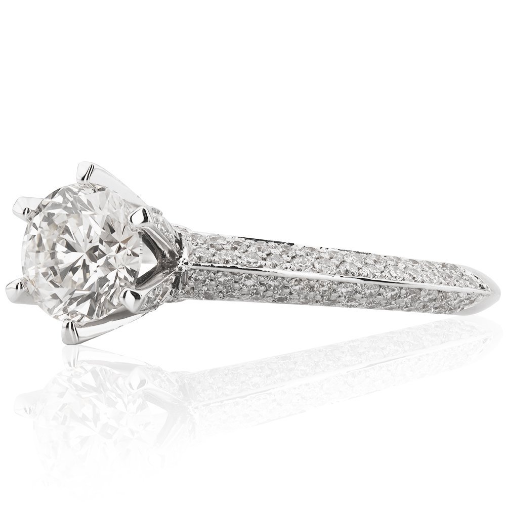 1,71 karatlık bu yüzük, merkezde yer alan ışıltılı yuvarlak kesim pırlantayla büyüleyici bir görünüm sunuyor. Altı tırnaklı klasik montür, taşın tüm ışığını kusursuzca ortaya çıkarırken; yanlara doğru incelen ve dört sıra minik pırlantayla süslenmiş şerit, tasarıma zarafet katıyor. Göz kamaştırıcı detaylarıyla bu yüzük, aşkın en parlak halini simgeliyor.