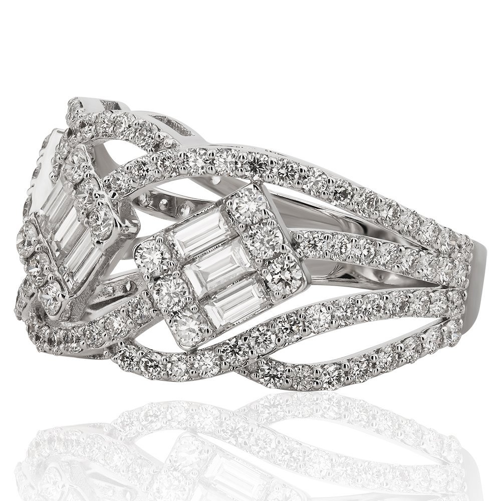 2,02 karat pırlantanın etkileyici birleşimiyle hayat bulan bu yüzük, birbirini kesen zarif kıvrımların ortasına yerleştirilen üç dikdörtgen motifle göz alıcı bir hareket yakalıyor. Baget ve yuvarlak kesim taşların mükemmel uyumu, tasarıma hem klasik bir derinlik hem de çağdaş bir dinamizm katıyor. Işıltısıyla tüm dikkatleri üzerine çeken bu parça, özgünlükten ödün vermeyenlerin favorisi olacak.