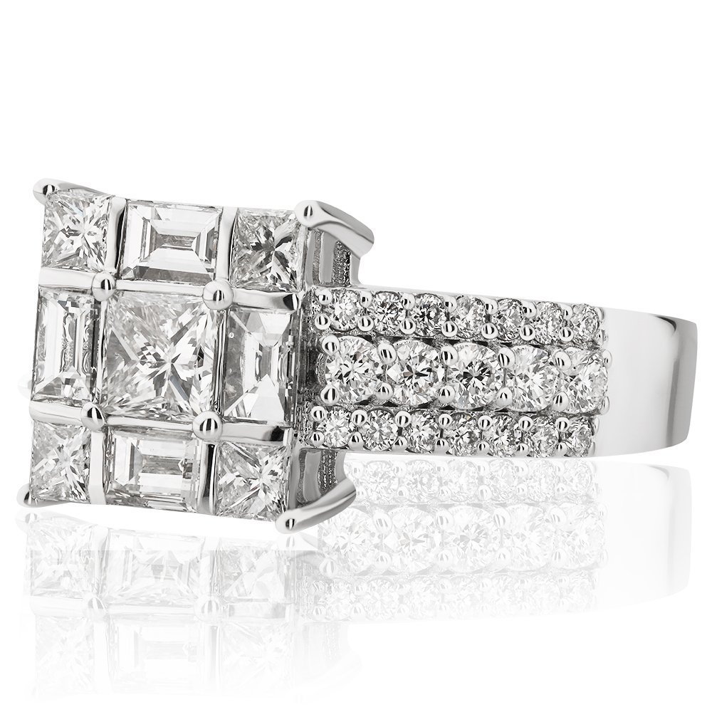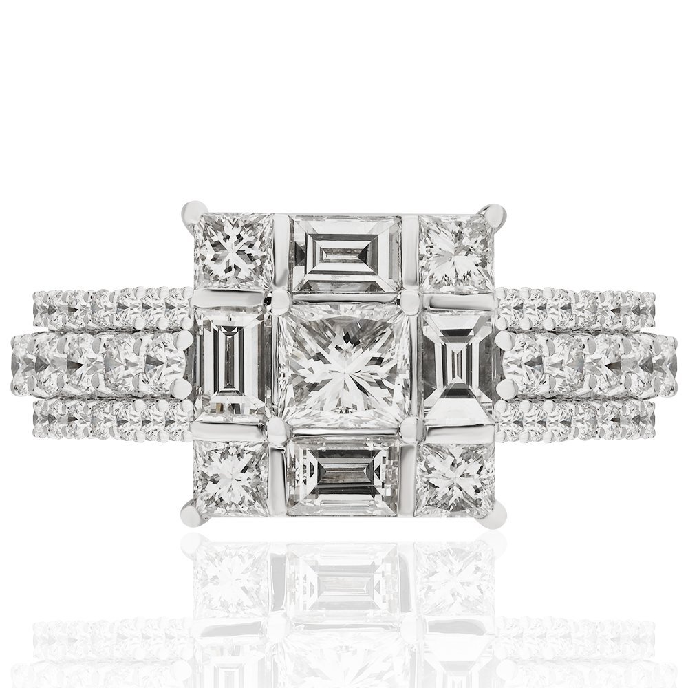 2,04 karat pırlanta ihtişamıyla hazırlanmış bu yüzük, adeta geometrik bir sanat eseri. Ortada prenses ve baget kesim taşlarla kurgulanmış simetrik bir düzen yer alırken, her bir köşe parıldayan prenses taşlarla çevrelenmiş. Üç sıralı yuvarlak kesim pırlanta detaylarla bezeli beyaz altın yüzük, ışıltıyı tüm yüze yayıyor. Göz alıcı mimarisiyle hem güçlü hem de zarif duruşun sembolü.