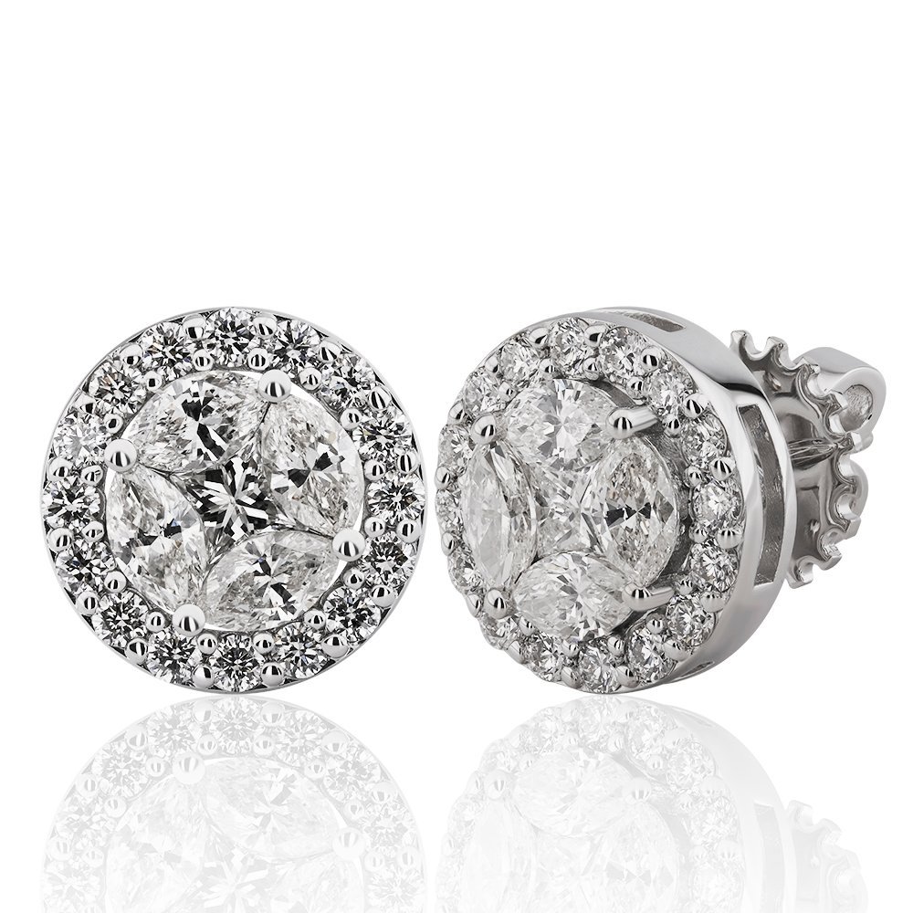 2,09 karat pırlantanın büyüleyici birleşimiyle tasarlanan bu küpelerde, dört adet marquise kesim taşın çiçek benzeri yerleşimi merkezde dikkat çekerken, etrafını çevreleyen parlak yuvarlak kesim pırlantalar ışığı çok yönlü yansıtarak göz alıcı bir ışıltı yaratıyor. Beyaz altın montür, taşların berraklığını ve netliğini ön plana çıkarırken, bu küpeleri zarafet dolu bir dokunuşla tamamlıyor. Gündüzden geceye uzanan şıklık arayışında kusursuz bir tercih.