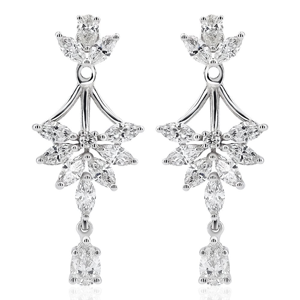Toplamda 2,10 karat pırlanta ile bezeli bu tasarım küpe, zarif yaprak formundaki taşlarıyla doğadan ilham alan etkileyici bir görünüm sunuyor. Tüm taşlar markiz kesim formda tasarlanmış olup, merkezde buluşarak çiçeksi bir kompozisyon yaratıyor. Alt bölümde sallantılı şekilde yer alan damla formlu pırlanta, hareketle birlikte ışığı zarifçe yansıtarak tasarıma dinamizm katıyor. Beyaz altın montür ile tamamlanan bu parça, DGA sertifikasıyla kaliteyi ve ışıltıyı bir arada sunuyor.