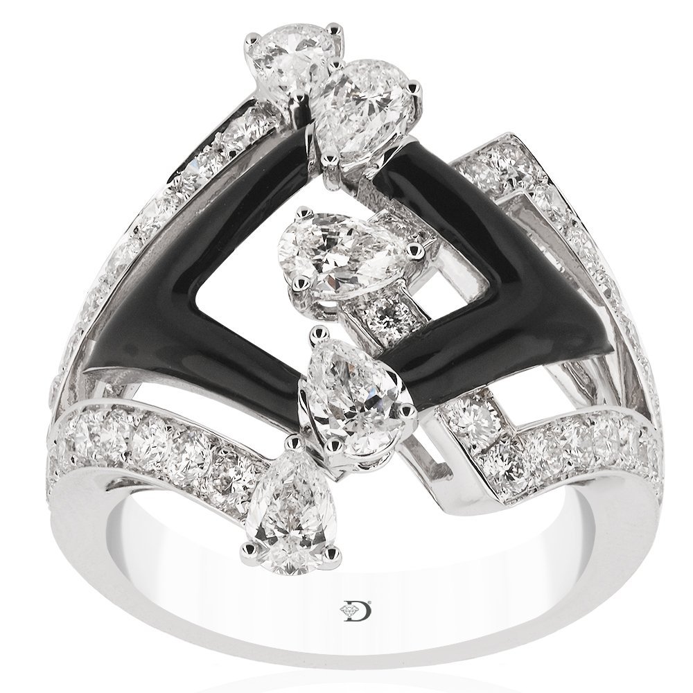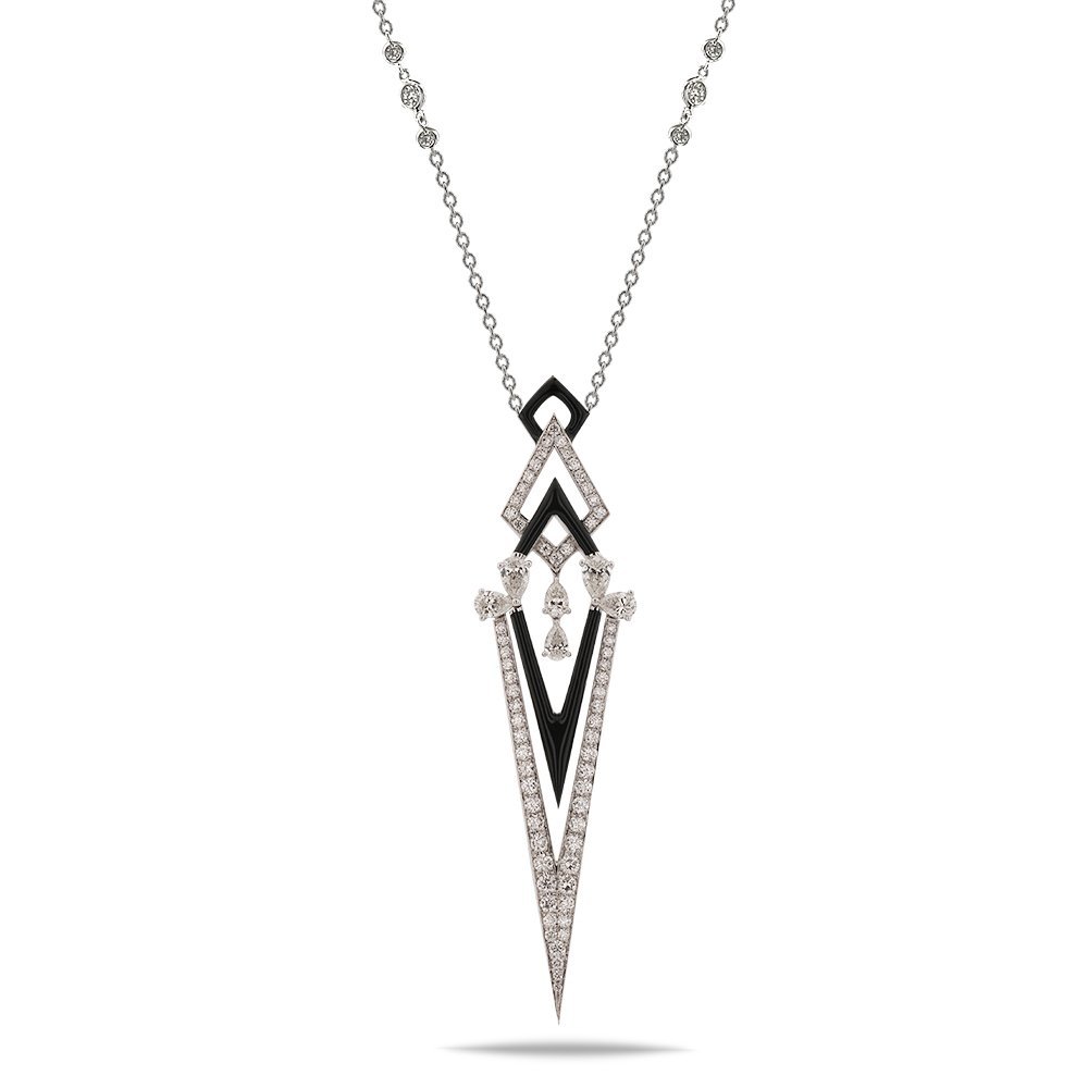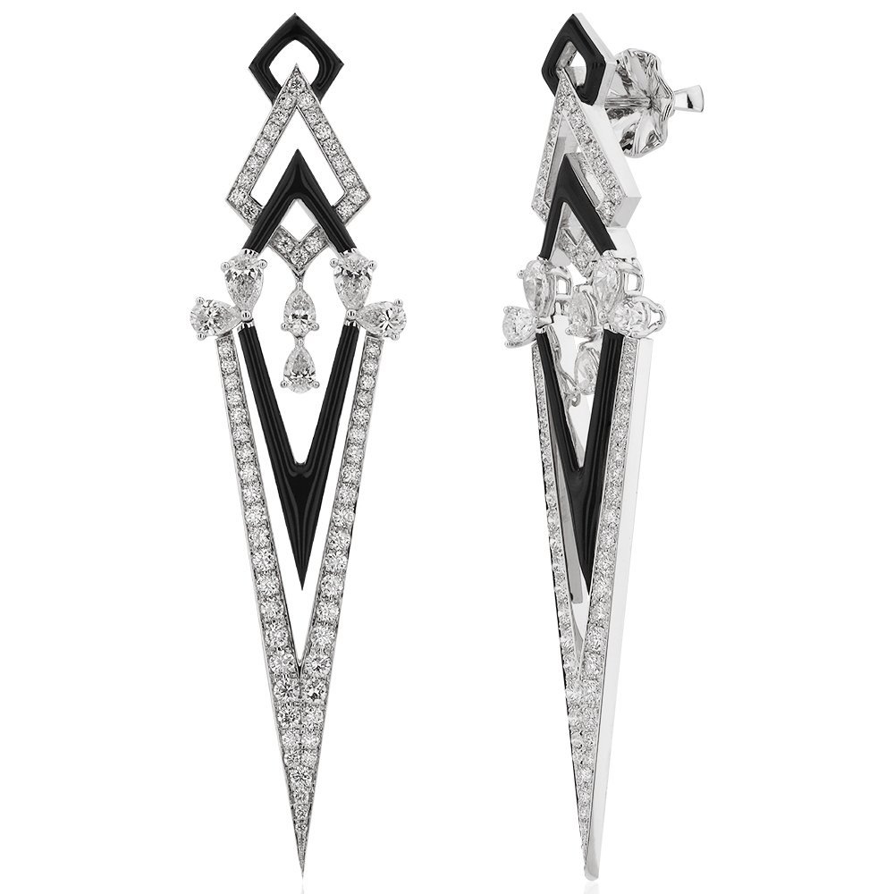 Beyaz altının ışıltısını siyah mine detaylarla buluşturan bu bileklik, toplam 2,18 karatlık damla, markiz ve yuvarlak kesim pırlantalarla çarpıcı bir görünüm sergiliyor. Geometrik hatları ve zarif çizgileriyle modern bir duruşa sahip olan tasarım, özel günlerinizde stilinizi öne çıkararak güçlü ve iddialı bir şıklık sunuyor.