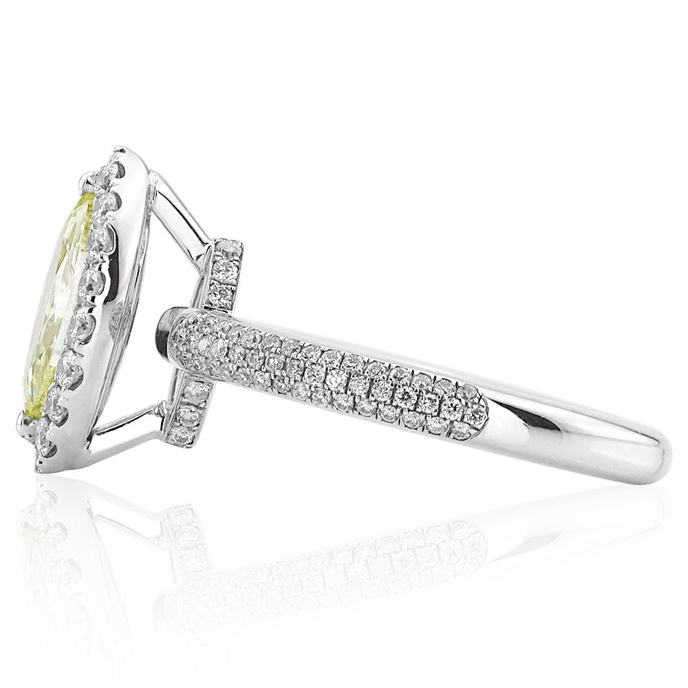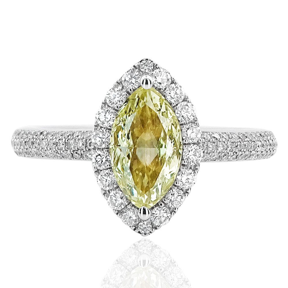 2,22 karatlık bu yüzük, limon sarısı tonlarında göz alıcı bir markiz kesim fancy pırlantayı merkezine alıyor. Parlak yuvarlak kesim pırlantalarla çevrelenmiş taş, zarif üç sıralı pırlanta işlemeli bantla birleşerek modern zarafetin en parıltılı hâlini sunuyor.