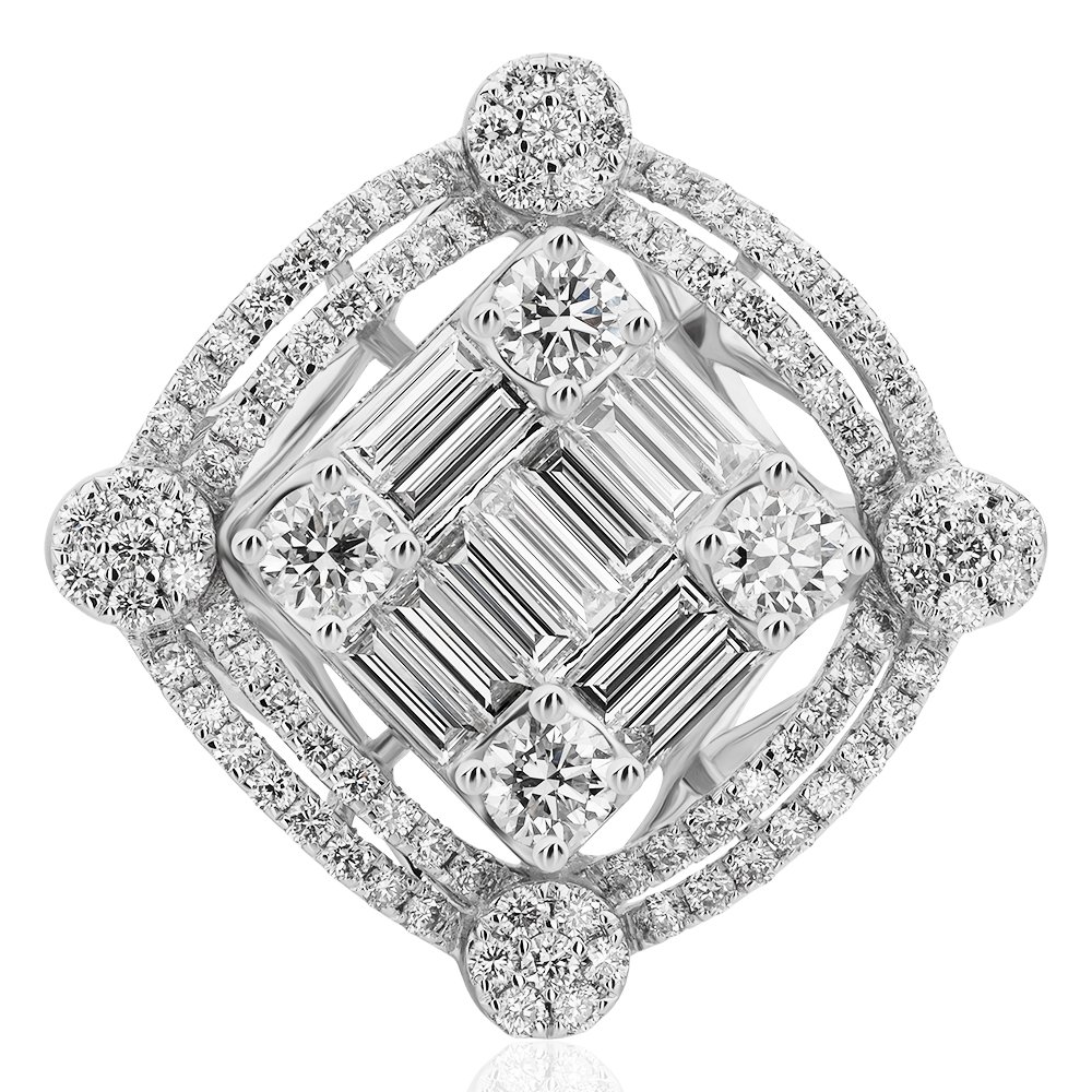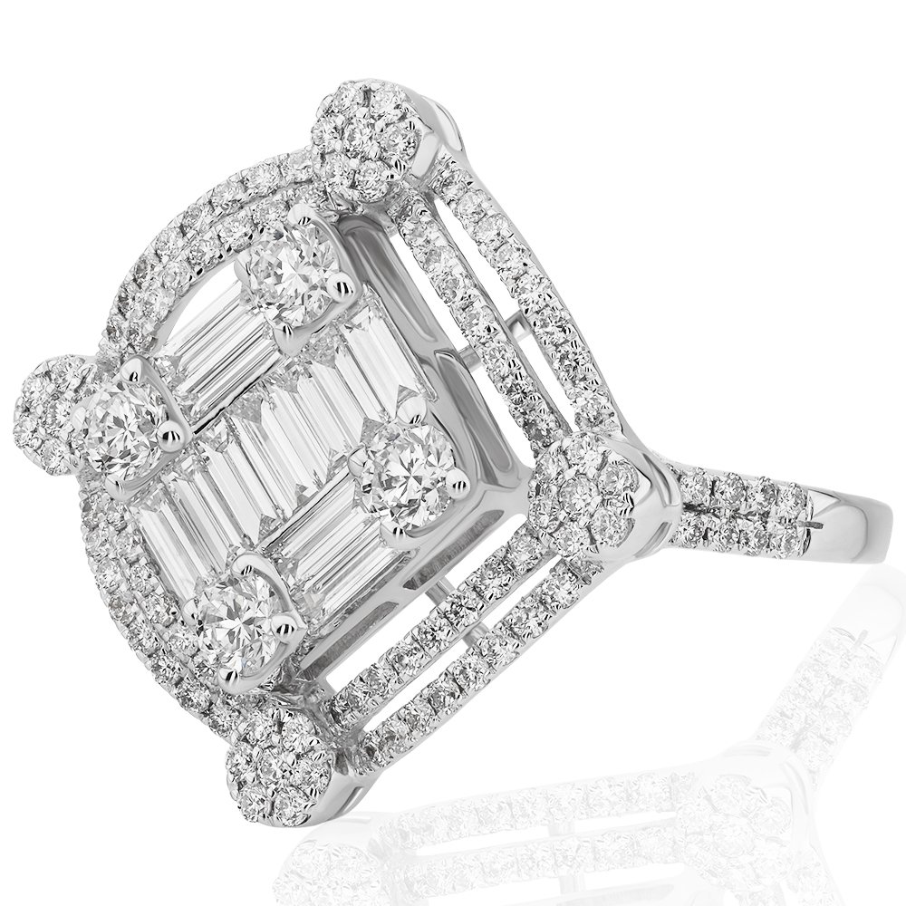 2,27 karat pırlanta ışıltısıyla bezeli bu gösterişli yüzük, tasarımındaki mimari detaylarla adeta bir mücevher anıtı gibi yükseliyor. Baget ve yuvarlak kesim taşların geometrik düzeni, merkezde göz kamaştırıcı bir simetri yaratırken, çevresindeki katmanlı pırlanta dizilimi derinlik hissini en zarif şekilde yansıtıyor. Klasik formlara modern bir ihtişam katan bu yüzük, her bakışı içine çekecek kadar iddialı.