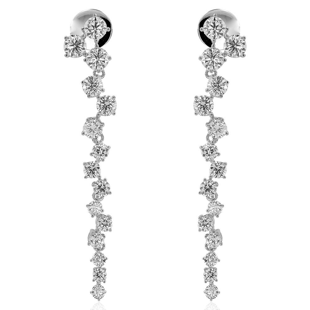 Toplam 2,36 karatlık yuvarlak kesim taşların zarif bir kıvrımla aşağı doğru sıralandığı bu sallantılı küpeler, ışığı adeta dans ettirerek hareketle birlikte canlı bir parıltı kazanıyor. Asimetrik yerleşim, tasarıma modern bir dinamizm katarken; beyaz altın montür her bir taşın berraklığını öne çıkarıyor. Işıltının hafiflikle buluştuğu bu tasarım, zarafetini sessizce ama etkileyici biçimde duyurmak isteyenler için.