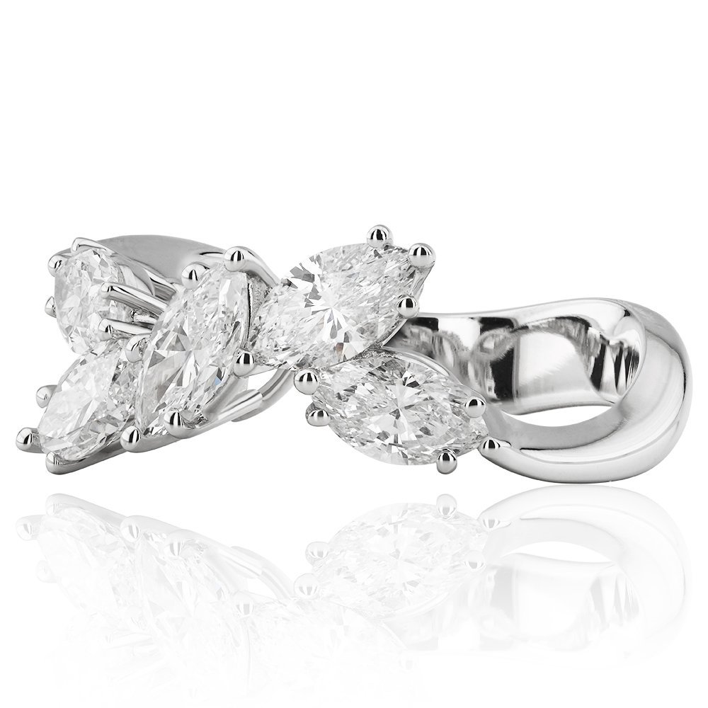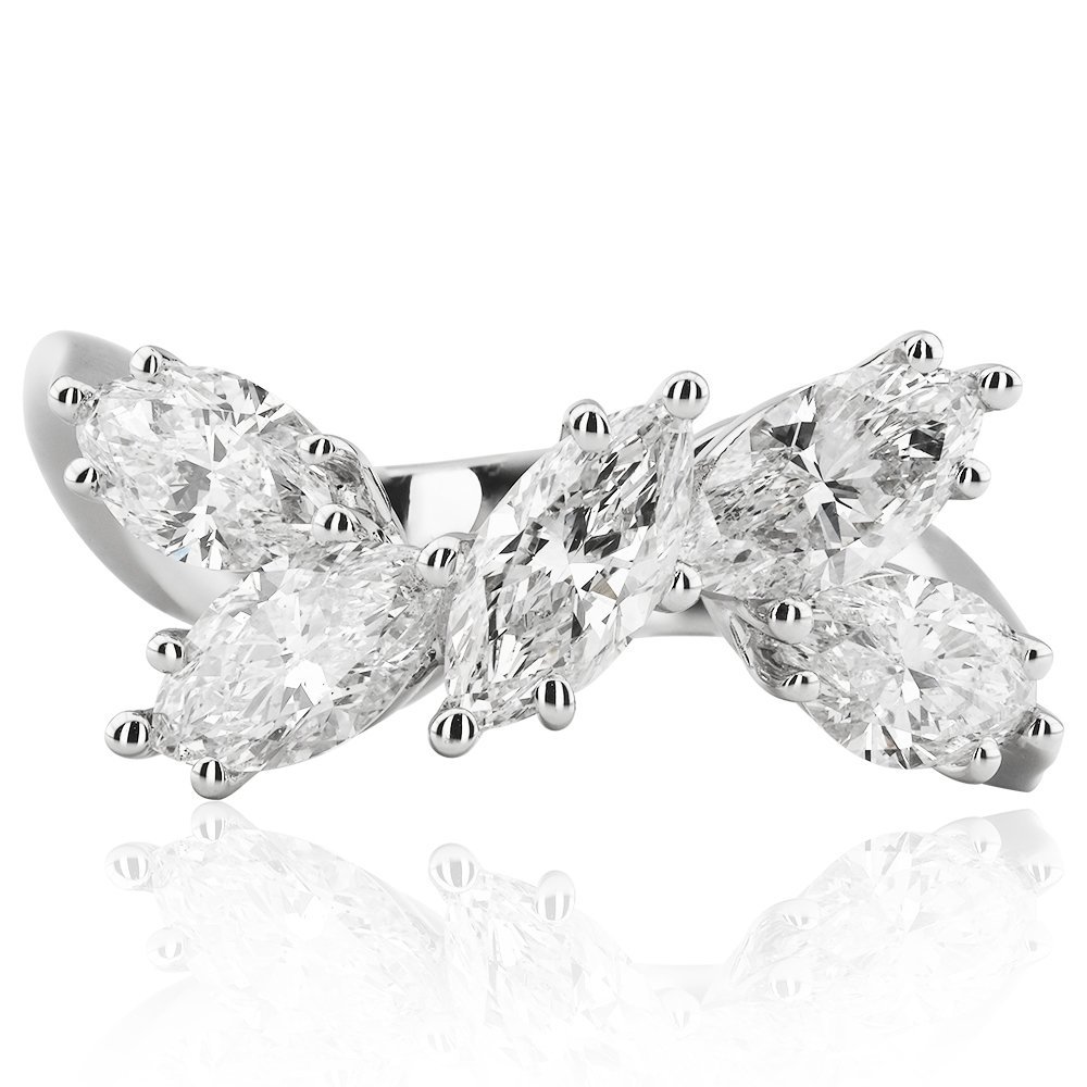 Toplamda 2,46 karat pırlanta taşla bezenmiş bu yüzük, markiz kesimin zarafetini yalın ve güçlü bir formda buluşturuyor. Akıcı ve çapraz yerleşimli taş dizilimi, ışığı her hareketle dans ettirirken, beyaz altın üzerindeki parlaklıkla birleşerek tasarımı göz alıcı bir inceliğe taşıyor. Modern bir zarafet arayanlar için kusursuz bir seçenek.