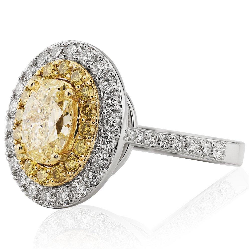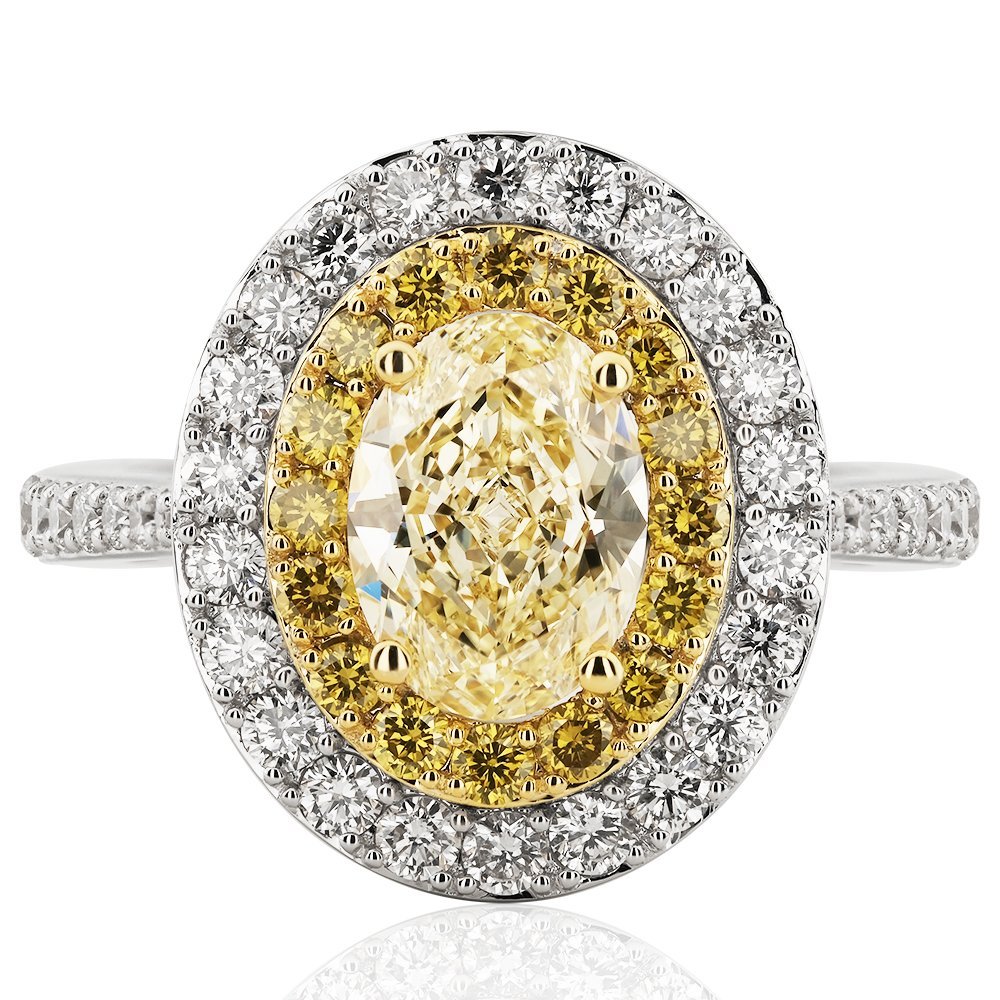 2,51 karat toplam taş ağırlığına sahip bu yüzük, ışığın en ihtişamlı tonlarında parlayan bir başyapıt. Merkezde yer alan oval kesim sarı pırlanta, sıcaklığı ve canlılığıyla göz kamaştırırken, çevresini saran sarı mikro pırlanta dizilimi, taşı adeta altın bir ışıltıyla çerçeveliyor. İkinci sıra ise klasik beyaz pırlantalardan oluşuyor; bu kontrast, tasarımı hem çarpıcı hem zarif kılıyor. Beyaz altın üzerine inşa edilen bu yüzük, renk oyunlarıyla sınırları zorlayan, görkemli bir şıklığın temsilcisi.