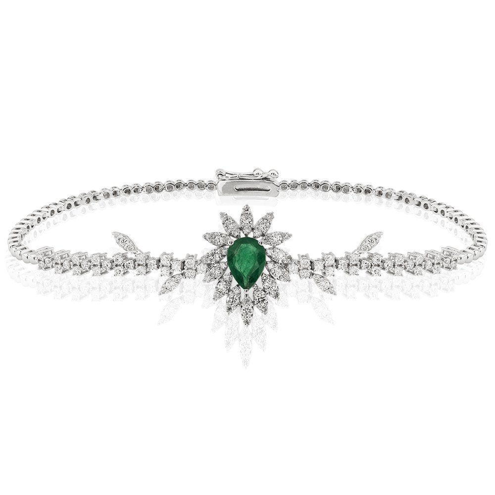 Beyaz altının incelikle işlendiği bu 2,89 karat sallantılı küpeler, merkezinde toplam 1,23 karat ağırlığında damla kesim zümrütlerin ihtişamını taşıyor. Yuvarlak kesim pırlantalar, yeşilin göz alıcı güzelliğini taçlandırırken, adeta doğadan ilham alan zarif bir çiçek formu oluşturuyor. Her kıpırdayışta farklı açılardan ışığı yakalayan taşlar, tasarıma göz alıcı ve seçkin bir ışıltı katıyor. Zarif olduğu kadar etkileyici bu küpeler, şıklığınızı unutulmaz kılacak.