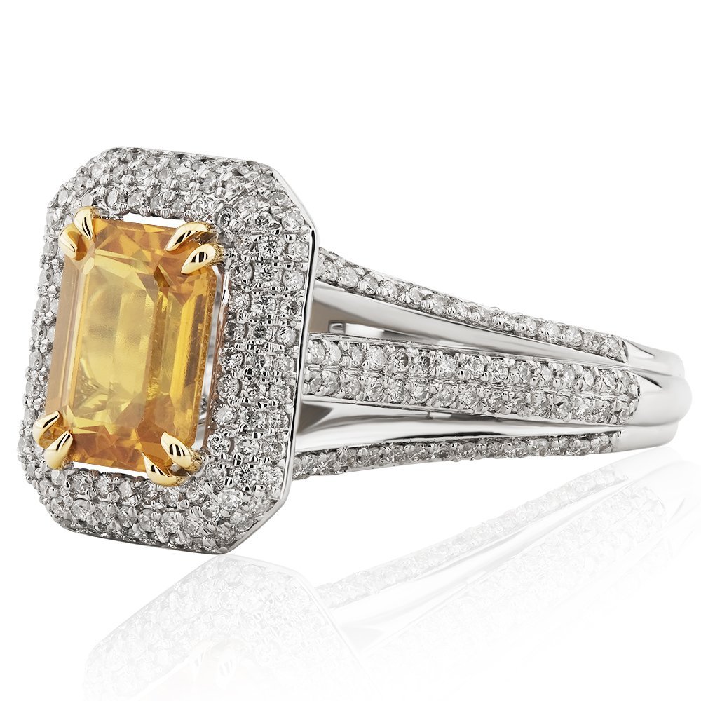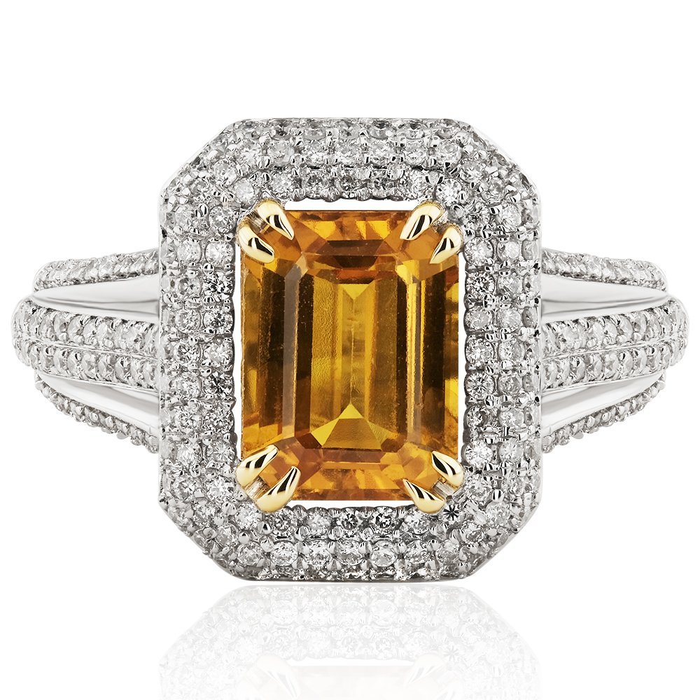 3,15 karatlık etkileyici bu yüzükte, merkezi süsleyen dikdörtgen emerald kesim sarı safir, altın rengi tırnaklarla zarifçe sabitlenmiş. Sıra halinde çevreyi saran pırlantalarla oluşturulmuş ışık halkası, bu sıcak ve zengin tonu büyüleyici bir parıltıyla tamamlıyor. Üç kollu tasarımıyla taşın ihtişamını destekleyen yüzük, göz alıcı bir incelik ve güçlü bir duruş sunuyor. Cesur ve kendinden emin bir stilin simgesi gibi…