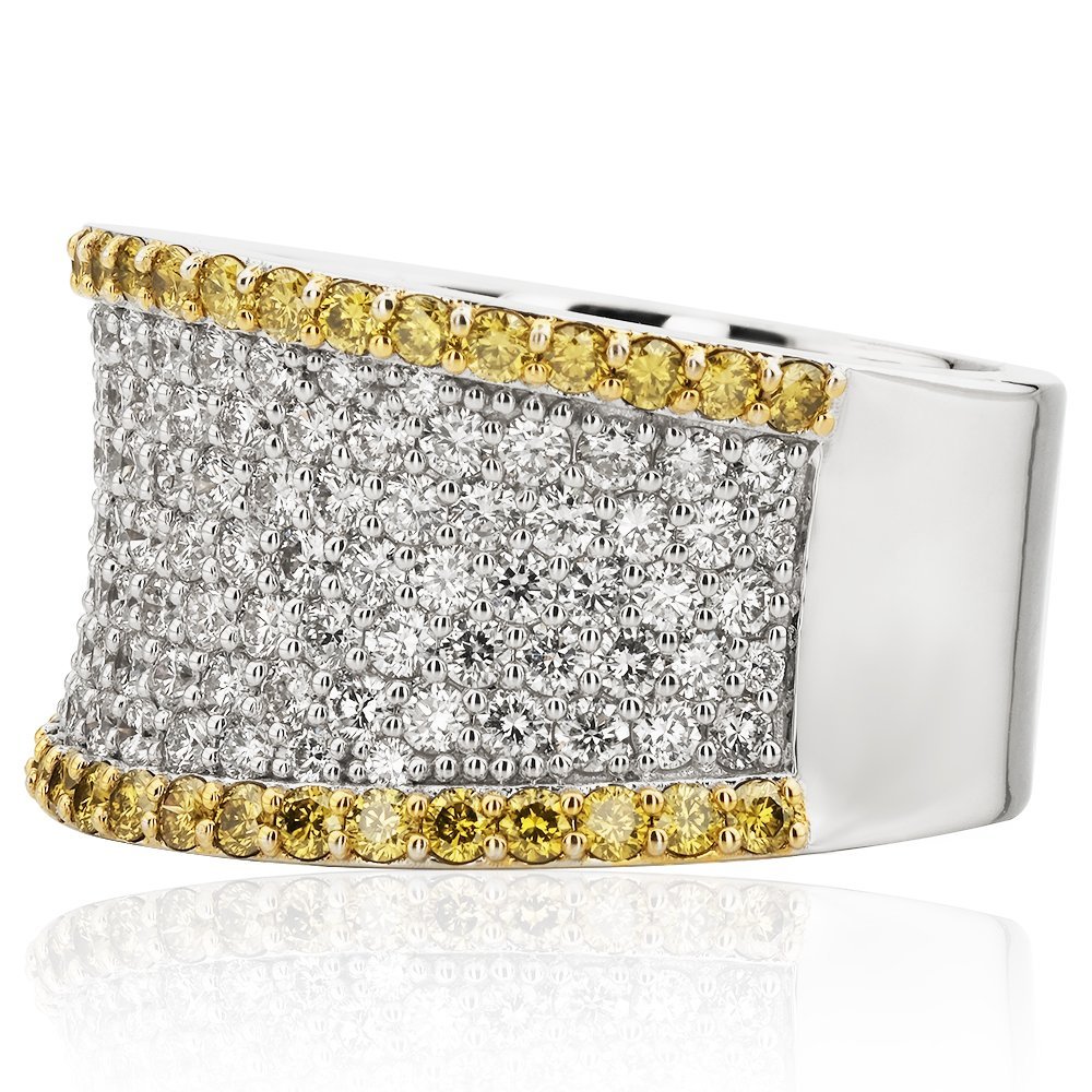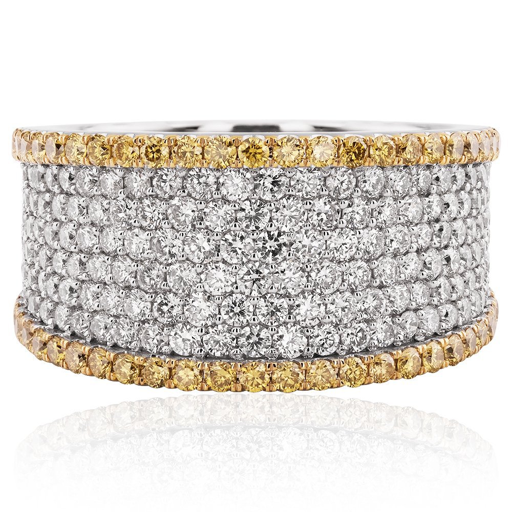 Toplamda 3,17 karatlık pırlantalarla bezenmiş bu yüzük, zarif kontrastların göz alıcı bir uyumunu yansıtıyor. Orta bölümdeki parlak beyaz pırlantalar, iki kenarda fancy yellow yuvarlak taşlarla çevrelenerek tasarıma sofistike bir derinlik katıyor. Göz alıcı ama dengeli bu dizilim, modern stilin güçlü bir ifadesi.