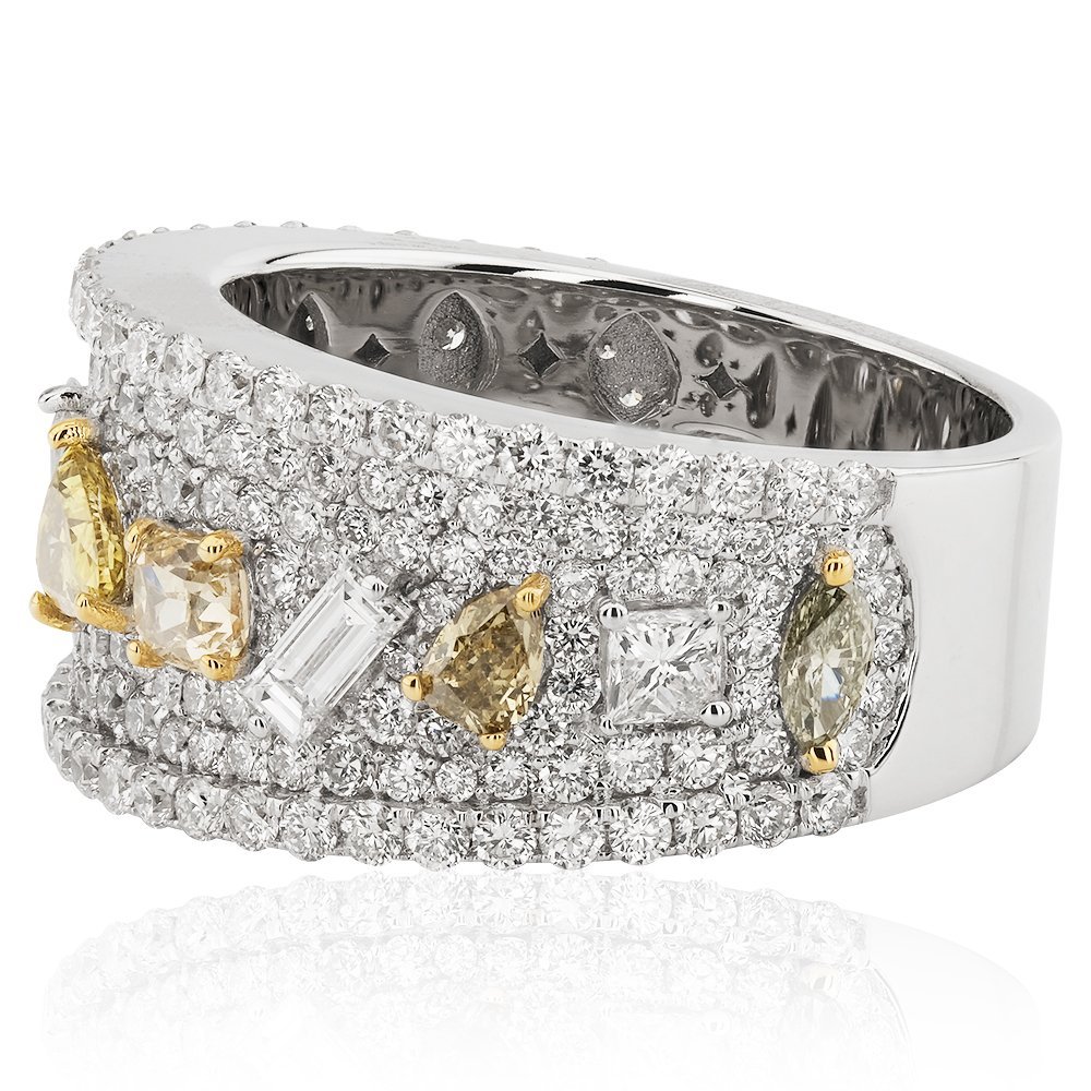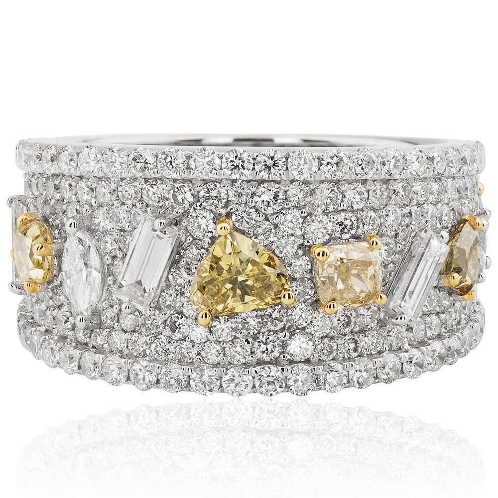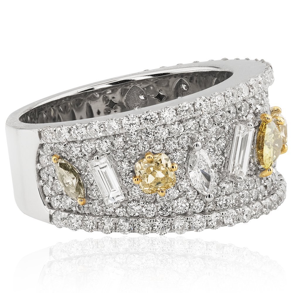 3,30 karatlık bu etkileyici yüzük, adeta pırlanta formlarının zarafetle buluştuğu bir mozaik. Markiz, baget, üçgen, yuvarlak ve prenses kesim taşlar, beyaz ve sarı tonlarıyla birbirini ustaca tamamlıyor. Her biri farklı bir hikâyeyi temsil eden bu taşlar, parlak zemin üzerindeki simetrik dağınıklığıyla sınırların dışında bir zarafet sunuyor. Alışılmışın dışında detaylara sahip bu tasarım, cesur bir zarafet beyanı gibi duruyor.