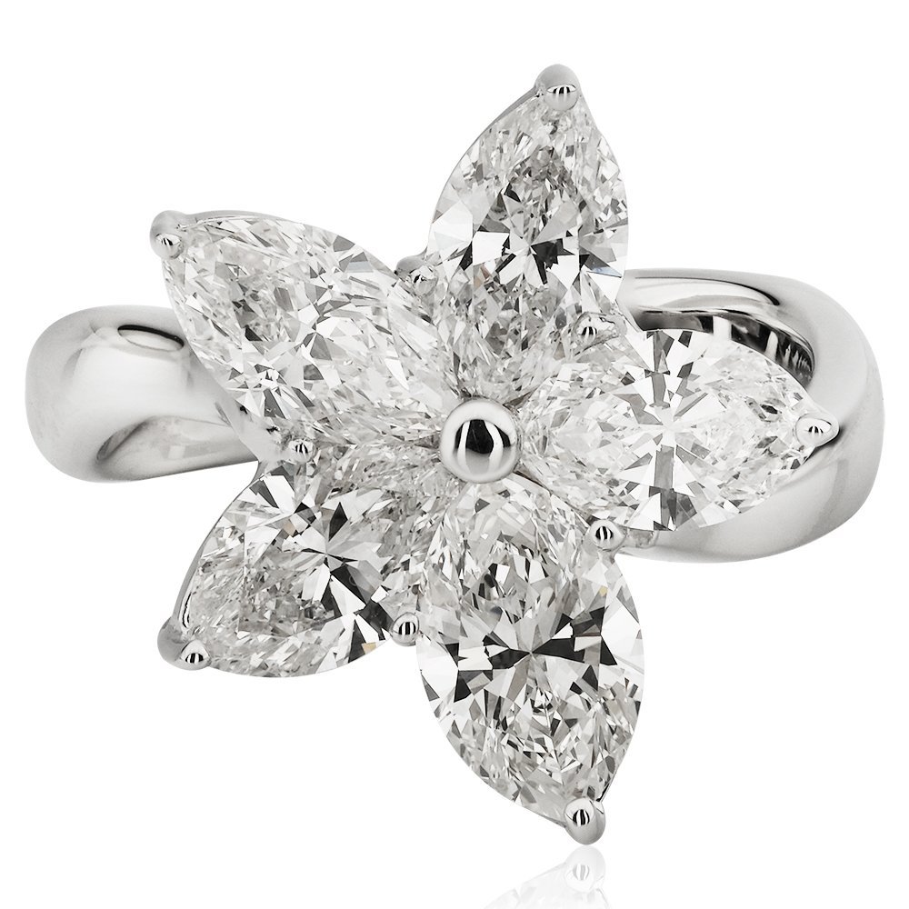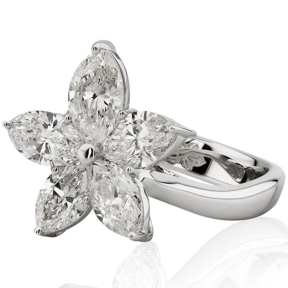 Toplam 3,32 karat ağırlığındaki markiz kesim pırlantalarla bezenmiş bu yüzük, beş yapraklı bir çiçeği zarafetle parmakta canlandırıyor. Işığı farklı açılarda yakalayan taşların her biri, doğanın kusursuz simetrisini taklit edercesine yerleştirilmiş. Göz kamaştıran bu tasarım, girdiği her ortamda çiçek açtıracak bir ışıltıya sahip.