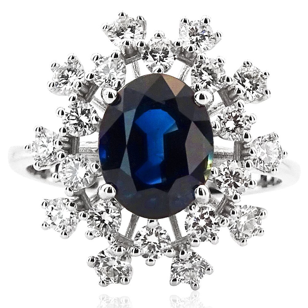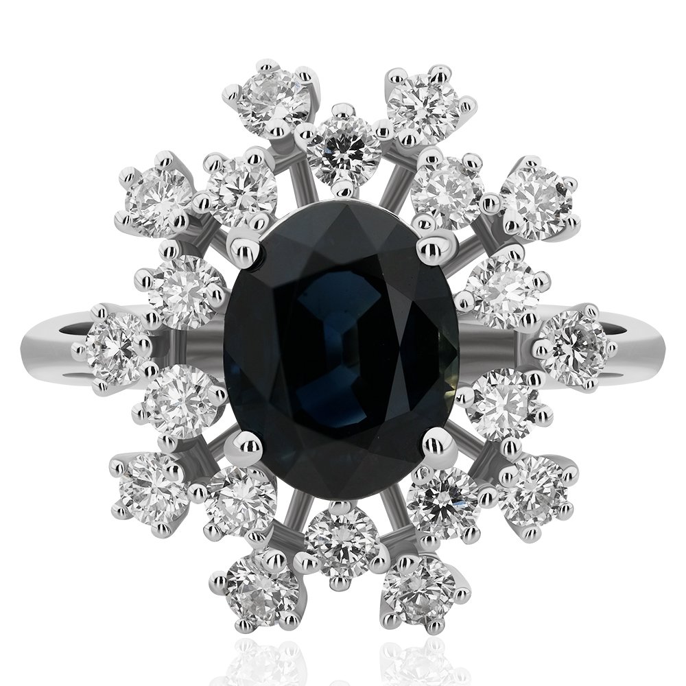 3,54 karatlık bu yüzükte, derin lacivert tonlara sahip oval kesim safir, etrafını çevreleyen yuvarlak pırlantalarla adeta bir yıldız gibi parlıyor. Klasik ve asil duruşuyla ihtişamı sade bir dille anlatan bu tasarım, geceye göz kırpan bir gökyüzü gibi…