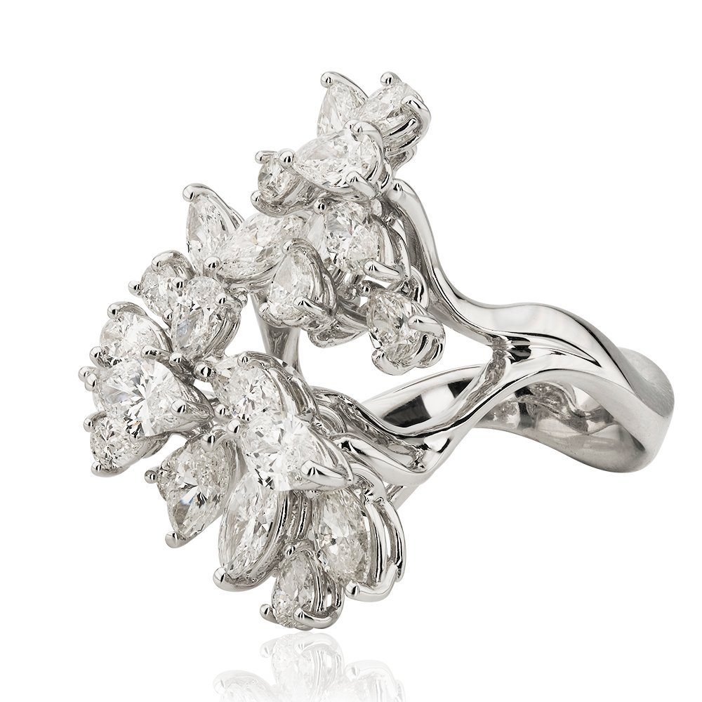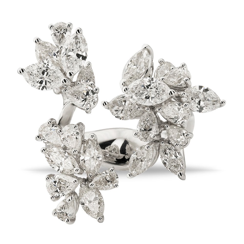 Toplamda 4,10 karat pırlantayla tasarlanan bu ihtişamlı yüzük, üç ayrı çiçek motifinde bir araya gelen markiz ve damla kesim taşlarıyla doğanın zarafetini parmak ucuna taşıyor. Göz alıcı bir kompozisyon sunan bu parça, adeta ışıltının çiçeklenmiş hali.