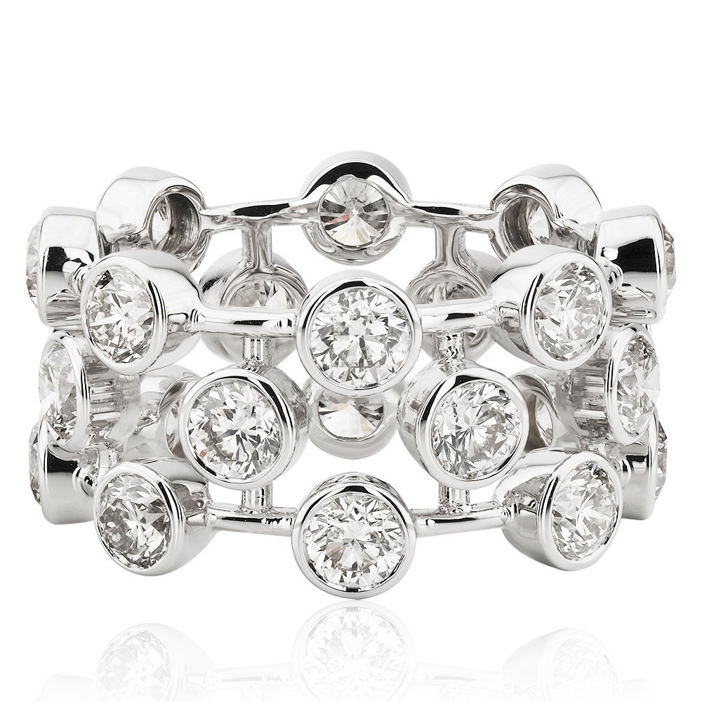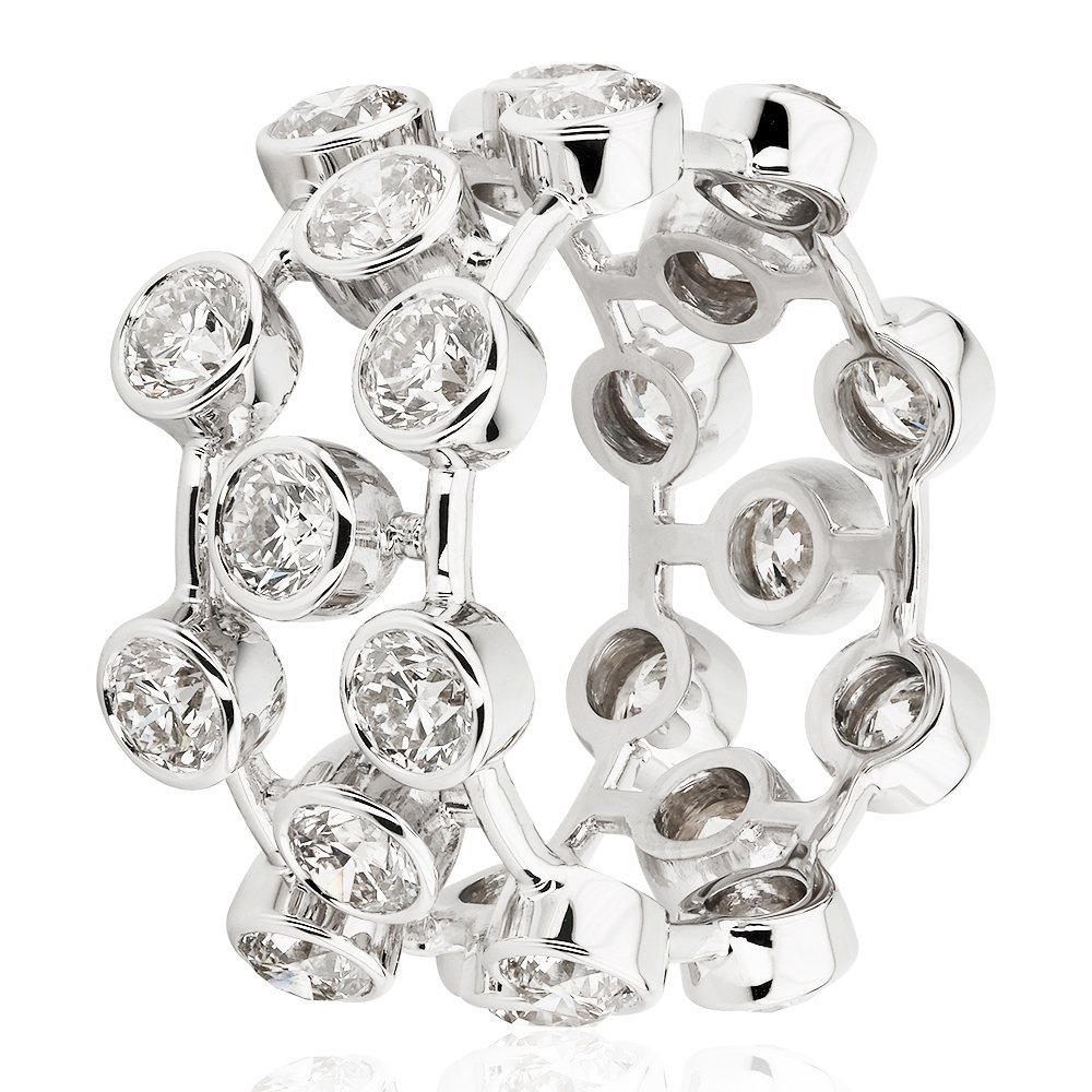 4,49 karatlık ihtişamıyla göz kamaştıran bu yüzük, modern geometrinin pırlantayla buluşmuş hali. Yuvarlak kesim taşlar, zarif yuvalarında ışığı her yönden yakalayarak etkileyici bir ışıltı yaratıyor. Cesur ve özgün tasarımıyla sıradanlığa meydan okuyan bu parça, tarzına iddialı bir imza atmak isteyenlerin favorisi olmaya aday.