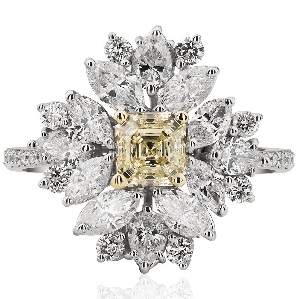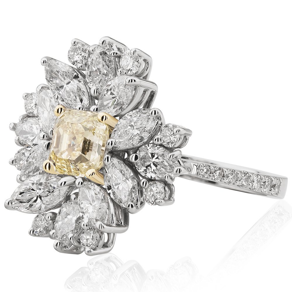 4,58 karat ağırlığındaki bu göz alıcı yüzük, zarafetin ve ihtişamın çarpıcı bir yorumunu sunuyor. Merkezde yer alan ışıltılı fancy light yellow asscher cut pırlanta, dört tırnaklı sarı altın montürle vurgulanırken; çevresini saran markiz, damla ve yuvarlak kesim beyaz pırlantalar adeta taşa bir taç gibi eşlik ediyor. Üç boyutlu çiçek formlu dizaynı ve yanlara doğru incelikle işlenmiş taşlı gövdesiyle bu yüzük, hayranlık uyandıran bir zarafeti parmak uçlarına taşıyor.