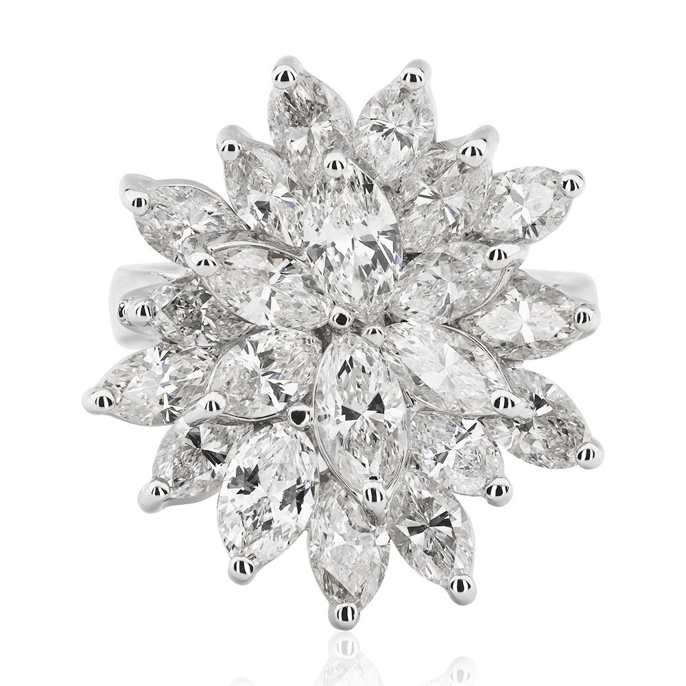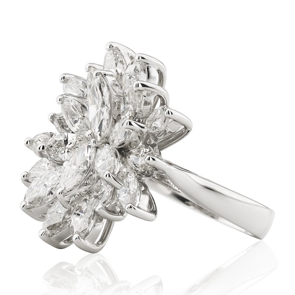 Toplamda 4,65 karat pırlantayla şekillenen bu etkileyici yüzük, bir çiçeğin açılış anını zarif bir ışıltıya dönüştürüyor. Markiz kesim taşlar, merkezden dışa doğru adeta bir yıldız gibi yayılıyor ve üç boyutlu bir görünüm kazandırıyor. Cesur ama zarif duruşuyla, göz kamaştırmayı sevenlerin stiline bambaşka bir soluk getiriyor.