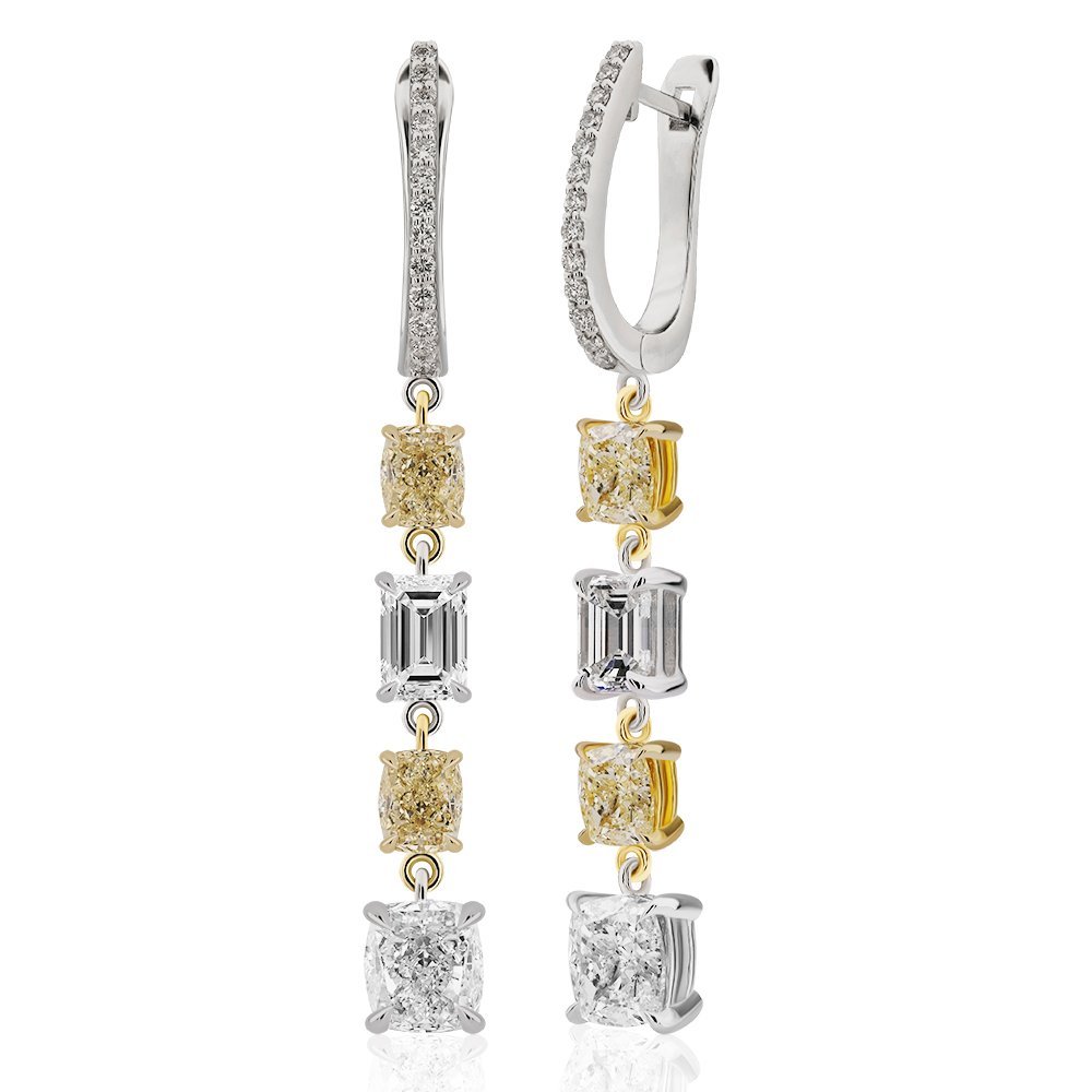 4,88 karat ışıltısıyla göz kamaştıran bu küpeler, fancy yellow cushion kesim pırlantalarla ve emerald kesim beyaz pırlantaların ritmik sıralanışıyla tasarımda zarif bir kontrast yaratıyor. Sarı altın ve beyaz altın yuvalar, her taşın rengini ve parlaklığını ön plana çıkarırken, en altta yer alan büyük boyutlu beyaz cushion kesim taşlar tüm kompozisyonun görkemli finalini sunuyor. Bu küpeler, farklılıkları bir araya getirerek bütüncül bir estetik yakalayanlara hitap eden cesur ama zarif bir yorum sunuyor.