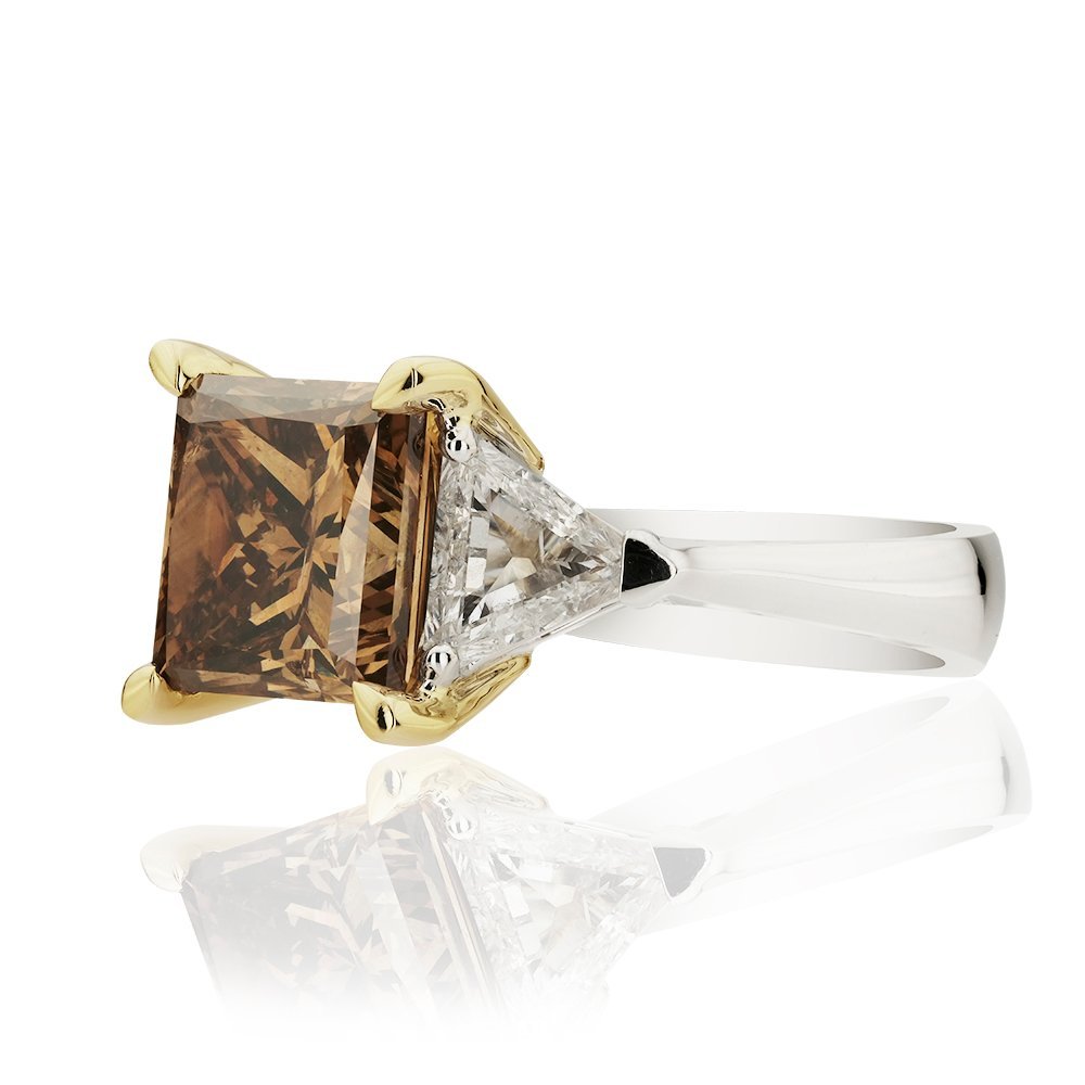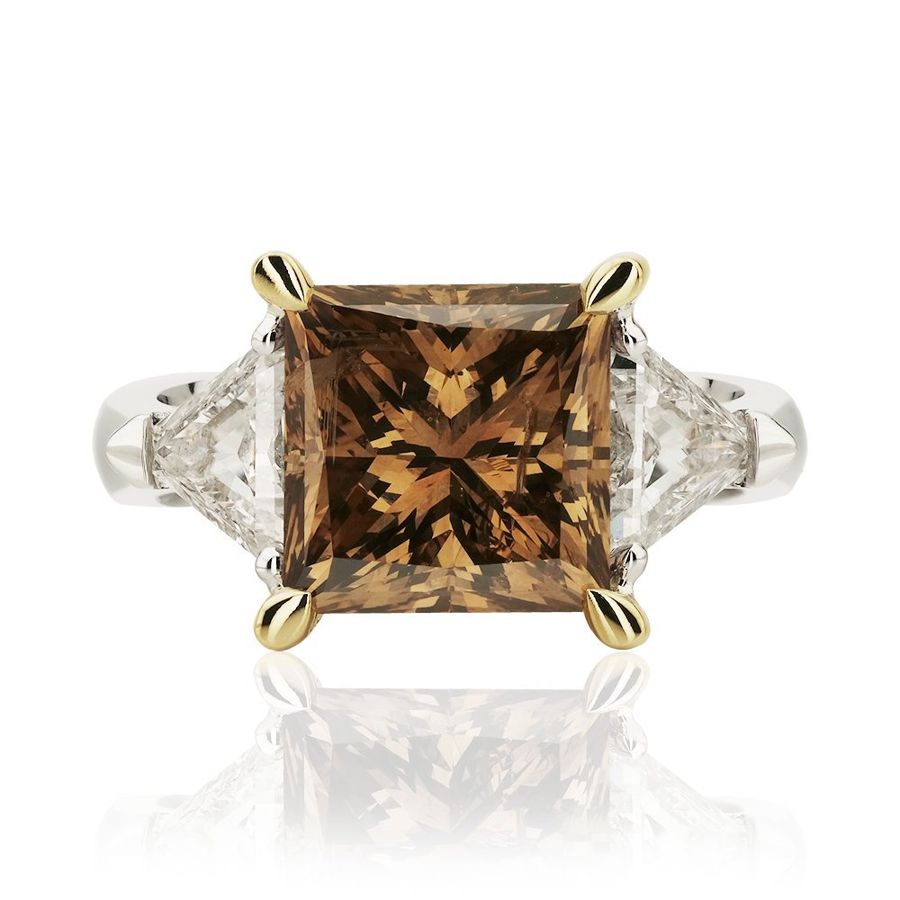 Toplamda 5,34 karatlık etkileyici taşlarla hayat bulan bu yüzük, ihtişamlı bir zarafetin simgesi. Merkezdeki büyük ve göz alıcı prenses kesim fancy intense brown pırlanta, sıcak tonlarıyla benzersiz bir karakter sunarken, her iki yanında yer alan üçgen kesim beyaz pırlantalar tasarımı sofistike bir dengede buluşturuyor. Sarı altın tırnak detaylarıyla vurgulanan bu eşsiz parça, güçlü ve rafine bir stilin cesur ifadesi.