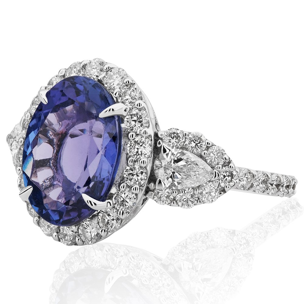 5,58 karatlık bu ihtişamlı yüzükte, merkezde yer alan oval kesim tanzanit, lavanta ile gece mavisi arasında dans eden göz alıcı rengiyle büyülüyor. Etrafını saran parlak kesim pırlantalarla ışığı adeta yakalayan bir halo oluşturulmuş. Yanlara zarifçe yerleştirilen damla kesim pırlantalar, tasarıma yumuşak bir geçiş ve zarafet katıyor. Her açıdan ışığı yansıtan bu parça, sadece parmakta değil, hafızalarda da kalıcı bir iz bırakır.
