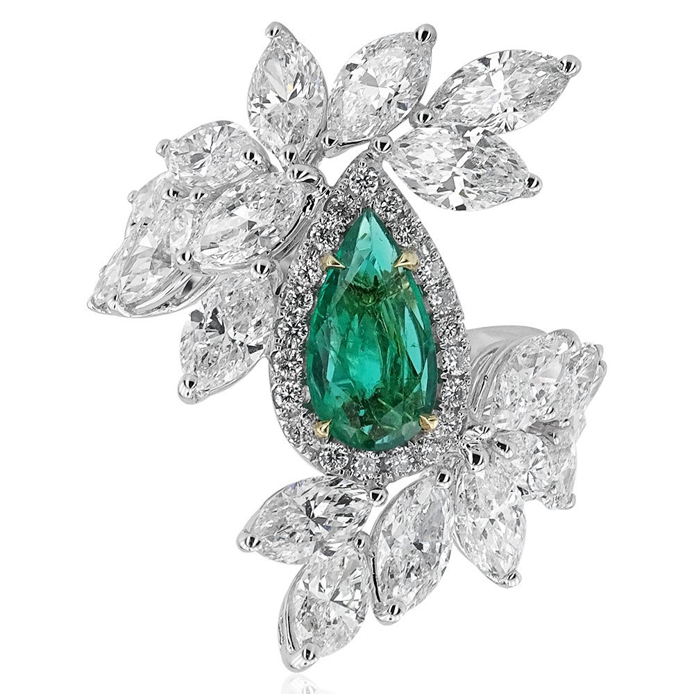 6,27 karatlık bu tasarımda, merkezde yer alan damla kesim zümrüt, çevresini saran markiz ve yuvarlak pırlantaların ışıltısıyla adeta bir çiçek tomurcuğu gibi açılıyor. Asimetrik formu ve taşların ahenkli yerleşimiyle, tek bakışta hafızaya kazınan özgün bir zarafet sunuyor.