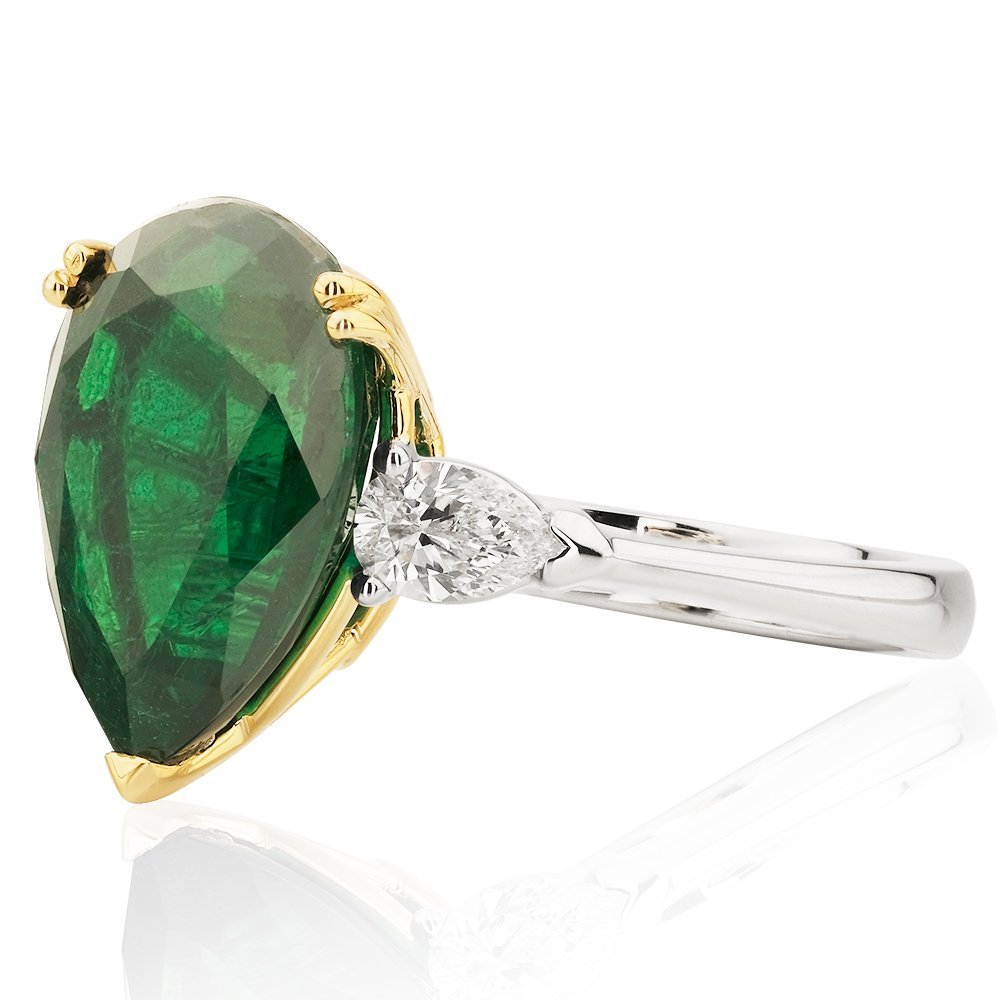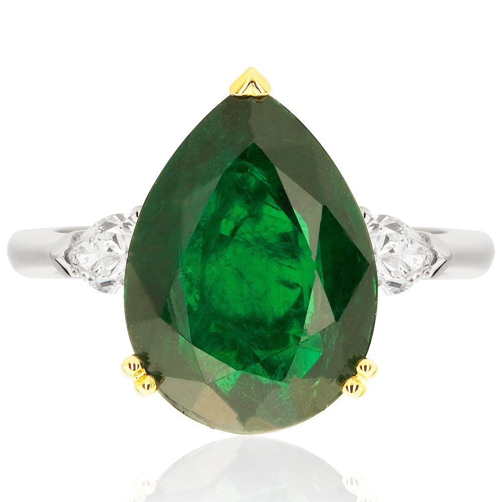 6,66 karatlık bu ihtişamlı yüzük, merkezde yer alan göz alıcı damla kesim zümrüt ile büyüleyici bir etki yaratıyor. Zümrüdün her iki yanındaki zarif damla kesim pırlantalar, tasarıma dengeli bir ışıltı ve asil bir tamamlayıcılık katıyor. Cesur, karakterli ve unutulmaz bir stilin mücevher hali.