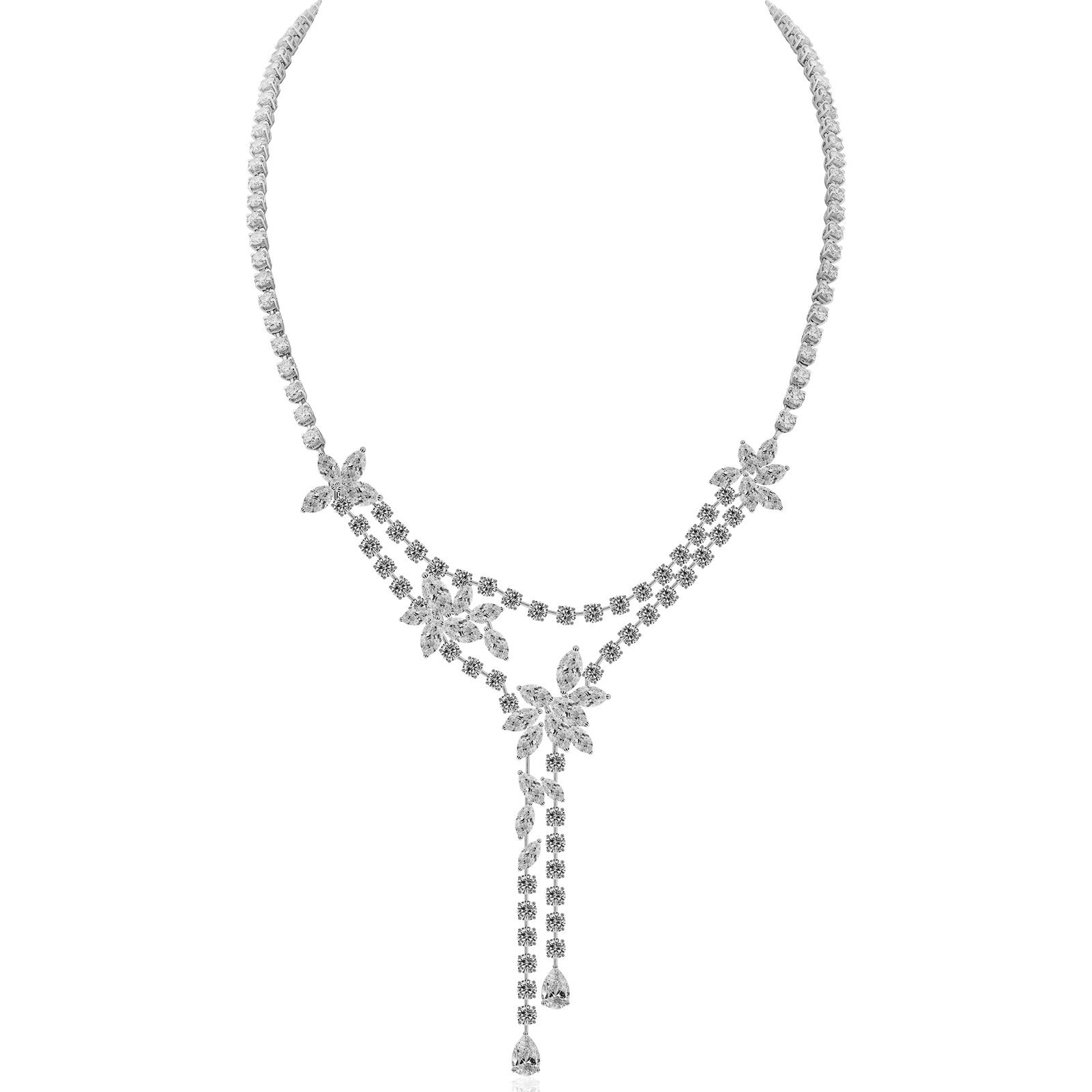 Zarafetin en sade ve etkileyici haliyle buluştuğu bu gerdanlık, 6,68 karat yuvarlak kesim pırlantalarla ışıldıyor. Kademeli büyüklükte dizilen taşlar, ortada yoğunlaşarak tasarıma göz alıcı bir denge katıyor. Her bir pırlanta, ışığı mükemmel şekilde yansıtarak etkileyici bir parlaklık sunuyor. Beyaz altın montürü, taşların saf ışıltısını ön plana çıkarırken, klasik ve zamansız duruşuyla her stile uyum sağlıyor. Özel günlerin vazgeçilmezi olacak bu gerdanlık, ihtişamı ve şıklığı bir araya getiren nadide bir parça