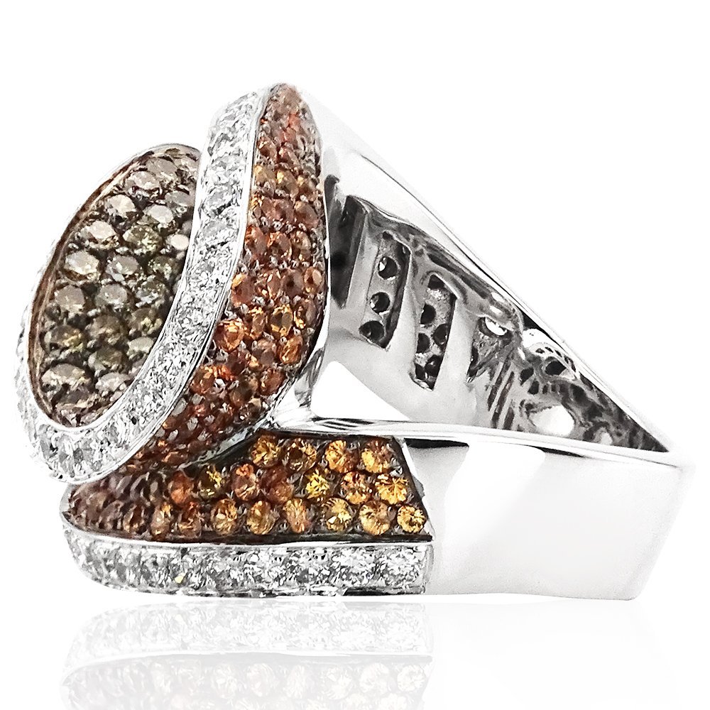 7,38 karat pırlantanın enerjisiyle hayat bulan bu yüzük, Safir ve Konyak rengi pırlanta taşlarıyla adeta bir sonbahar fırtınasını avucunuzda taşıyor. Organik kıvrımlarla sarılmış tasarımı, beyaz pırlanta şeritlerle vurgulanarak zarafetle cesaretin dengelendiği bir çizgi yaratıyor. Doğanın içsel ateşini yansıtan bu etkileyici form, klasiklerin dışına çıkmak isteyenlere unutulmaz bir imza sunuyor.