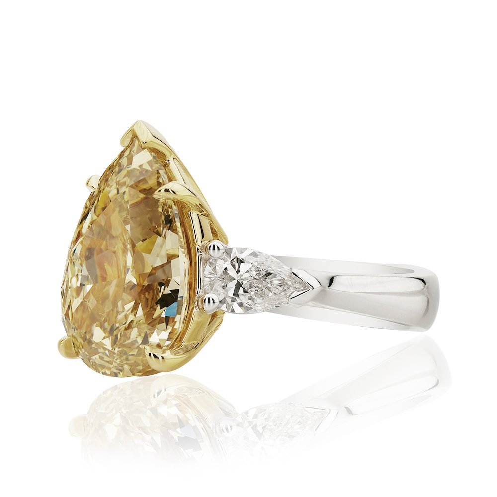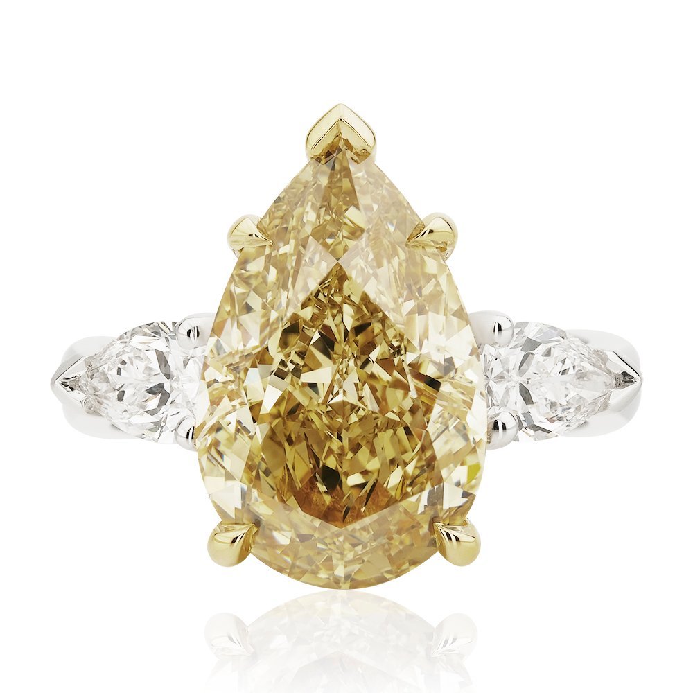 Gösterişli tasarımıyla dikkat çeken bu yüzüğün merkezinde yer alan damla kesim 7,51 karat fancy yellow pırlanta, altın rengi tırnaklarla zarifçe kavranmış. Yanlarda ona eşlik eden iki yarım damla kesim beyaz pırlanta ise, merkezin yoğun ışıltısını zarifçe çerçeveliyor. İddialı duruşu ve zarafetiyle sadece bir takı değil, aynı zamanda etkileyici bir stil beyanı.