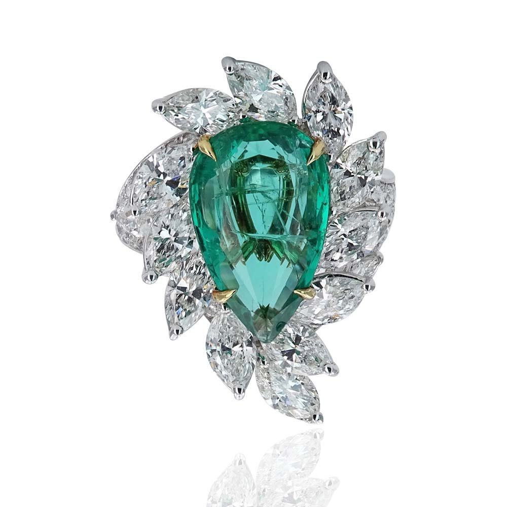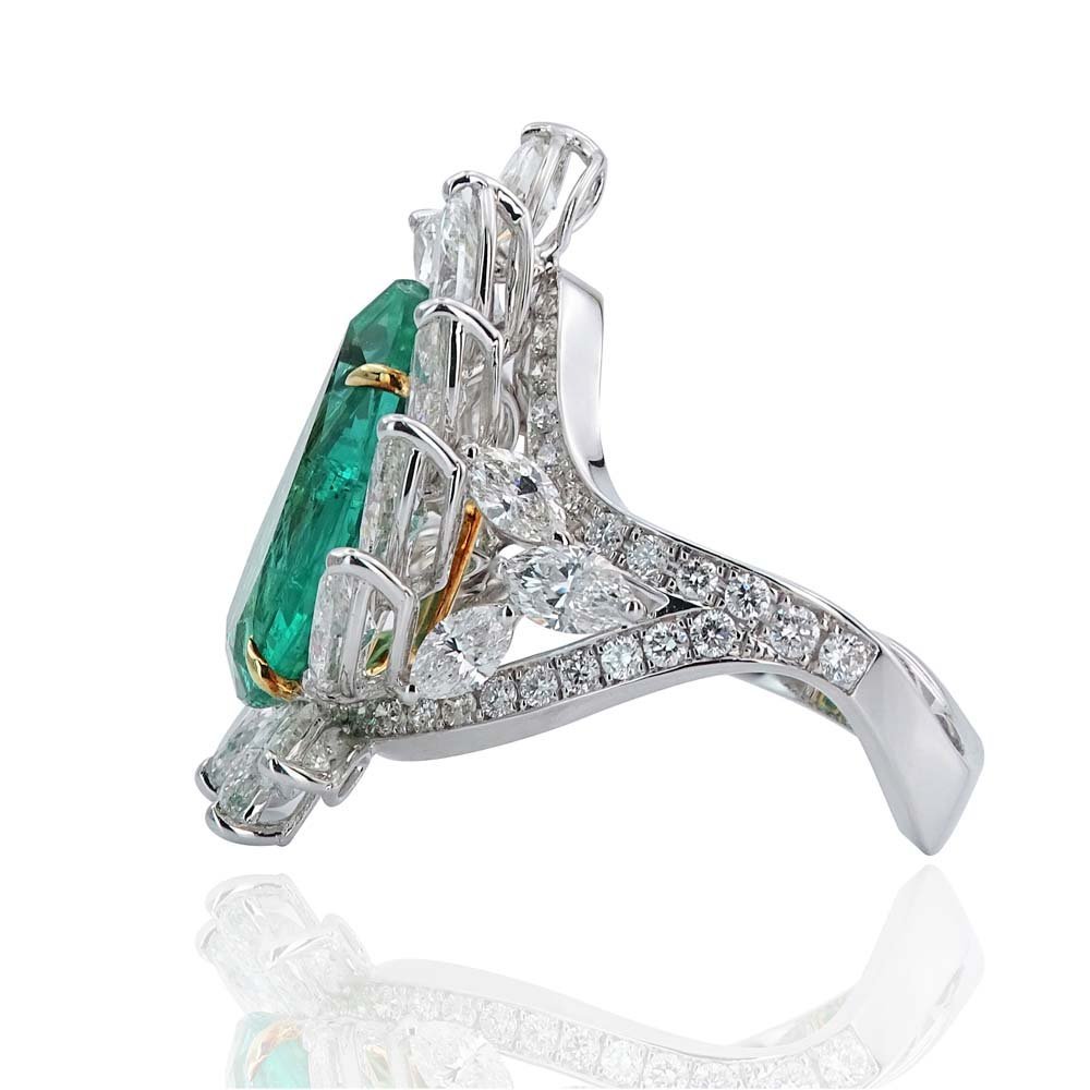8,44 karatlık bu yüzük, göz alıcı damla kesim zümrüt taşıyla merkezde ihtişamını ilan ediyor. Zümrüdü çevreleyen ışıltılı markiz kesim pırlantalar, adeta yapraklarla bezenmiş bir taç gibi tasarlanmış. Her bir taş, mücevherin hacmini artırırken zarafetinden de ödün vermiyor. Sonsuz zarafetiyle parmakta değil, hafızalarda yer eden bir başyapıt.