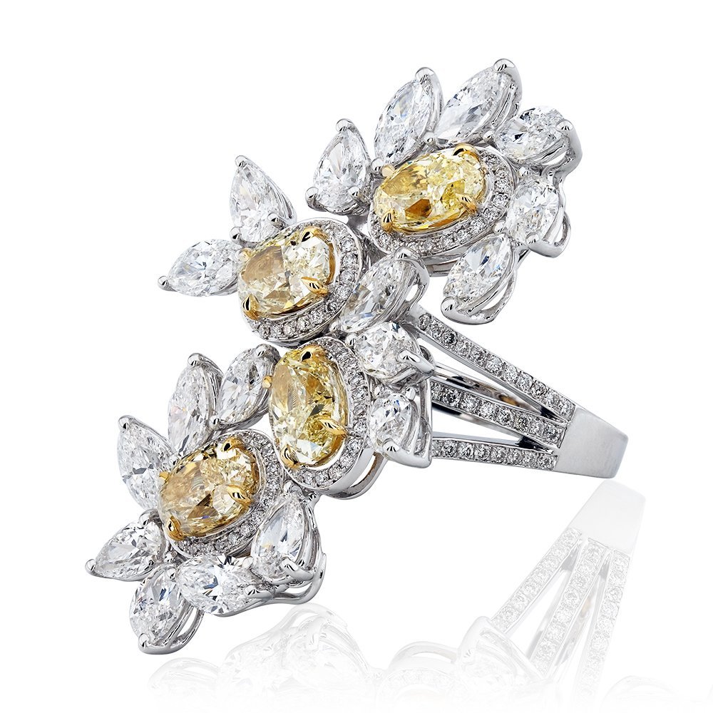 Toplamda 8,51 karat ağırlığındaki taşlarla hayat bulan bu yüzük, çiçeksi formuyla ihtişamın zarafetle buluştuğu bir başyapıt. Zemininde yer alan yuvarlak ve markiz kesim pırlantalar, parıltısını çevresine adeta ışık gibi yayarken, ortada konumlanan oval kesim fancy yellow pırlantalar tasarıma göz kamaştırıcı bir sıcaklık katıyor. Işıltının doğayla dans ettiği bu gösterişli parça, stilinde etkileyici bir imza arayanlara hitap ediyor.