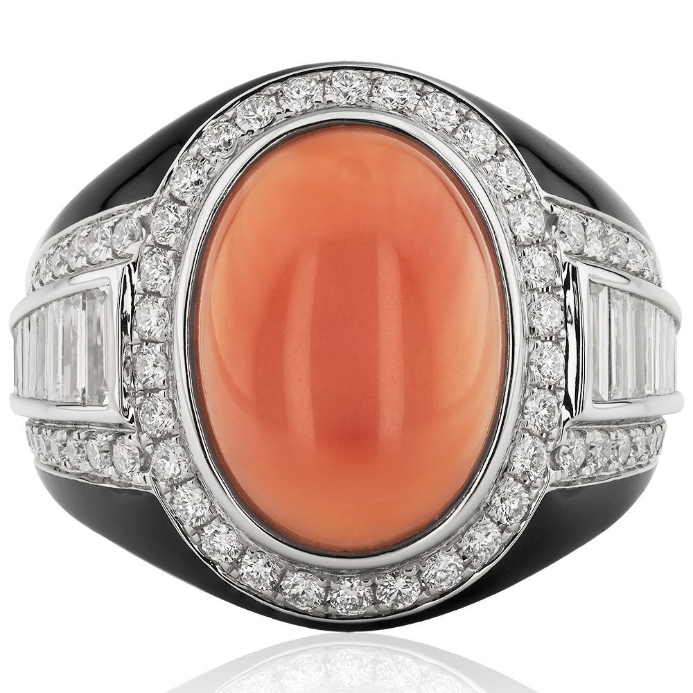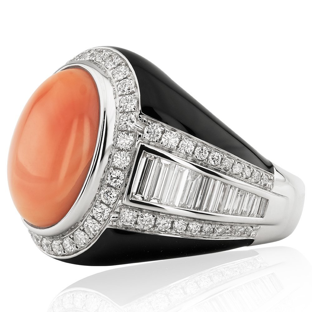 Göz alıcı merkezi taşıyla dikkat çeken bu tasarımda, etkileyici 9,55 karat değerindeki turuncu mercan taşı, kabaşon kesimiyle yumuşak bir zarafet sunuyor. Çevresini saran pırlanta sıraları ve baget kesim detaylar, siyah mineyle buluşarak kontrastın en şık halini ortaya koyuyor. Cesur ve karakterli duruşuyla tek bakışta unutulmaz bir etki bırakıyor.